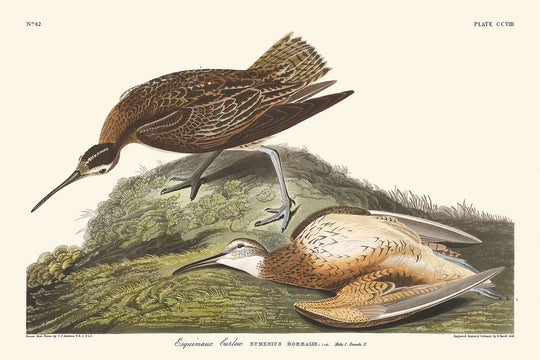 Il Curlew Esquimese di John James Audubon, pubblicato per la prima volta nel 1827, è tra le straordinarie illustrazioni di uccelli della straordinaria collezione di Audubon, "Gli Uccelli d'America." Questo pezzo affascinante cattura l'eleganza delicata e il volo rapido del Curlew Esquimese, un uccello i cui schemi migratori e abitudini sono tanto intriganti quanto l'illustrazione stessa.