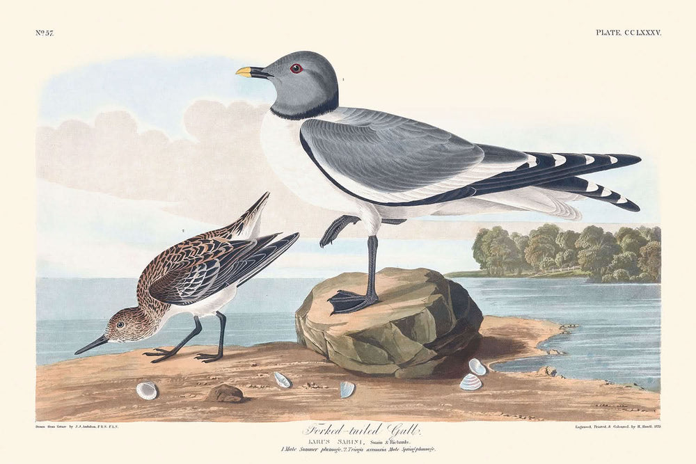 La stampa del Gabbiano dalla coda fork cattura una specie documentata dal Capitano Edward Sabine, i cui schemi migratori e abitudini sono splendidamente illustrati e descritti da Audubon. L'interazione di bianchi, grigi e sottili accenni di rosa nel piumaggio offre uno sguardo realistico sulla grazia di questo uccello marino.