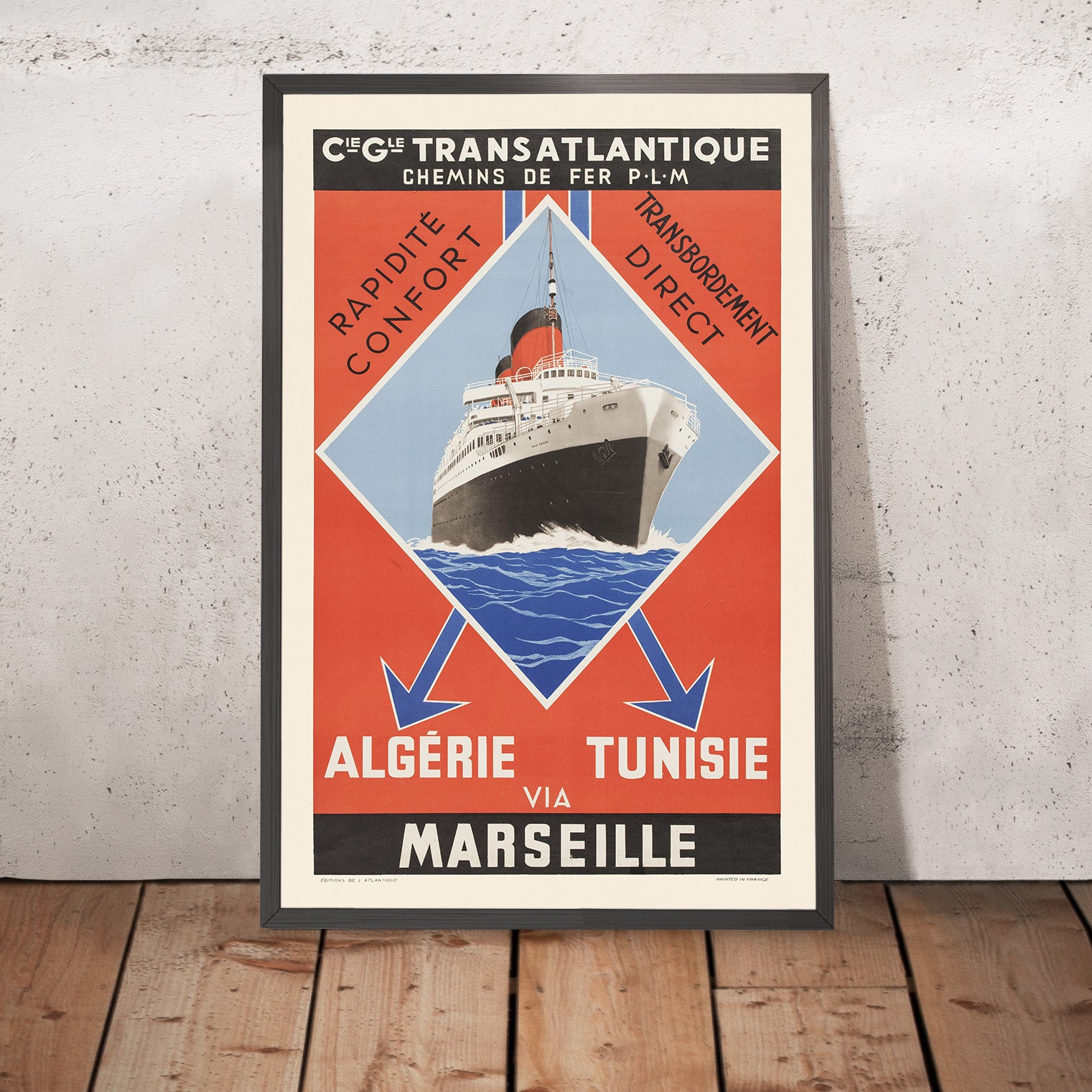 About the makers: the French Line (Compagnie Générale Transatlantique) was France’s storied steamship company—famed for its elegant liners and impeccable service—while PLM (Paris–Lyon–Méditerranée) was the railway that connected Paris with the southeast and the Mediterranean. Together they cultivated a sophisticated visual identity through posters like this one, commissioning talented designers to symbolize modern travel with bold geometry, streamlined forms, and impeccable typography. Even when the artist’s name is lost to history, the house style is unmistakably French and impeccably Art Deco.