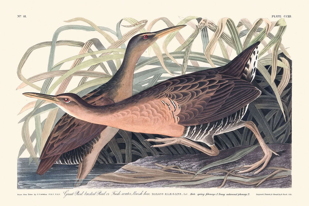 L'uso di colori vividi e dettagli intricati illumina lo sfondo paludoso denso, evidenziando la relazione unica dell'uccello con il suo ambiente. Quest'opera d'arte non è solo un piacere visivo ma anche un pezzo di conversazione, offrendo approfondimenti sui primi studi ornitologici e sulla capacità di Audubon di catturare momenti fugaci dell'arte della natura in piena piumatura.