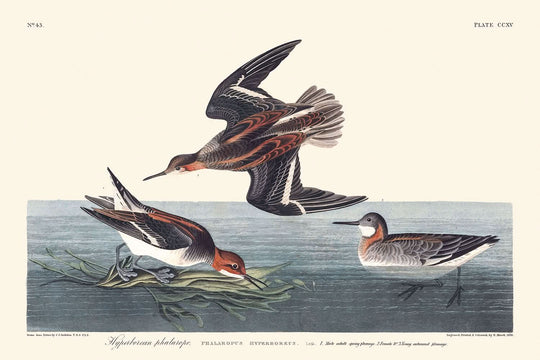 Questa stampa non solo celebra l'eredità artistica di Audubon, ma preserva anche il fascino di una specie il cui comportamento straordinario e le sue abitudini migratorie affascinavano i naturalisti del XIX secolo. Dalle osservazioni nella Baia di Fundy durante le migrazioni alle loro abitudini di nidificazione in Labrador, il Falaropo Iperboreo invita alla curiosità e all'ammirazione, rendendo questa stampa un'aggiunta coinvolgente a qualsiasi collezione.