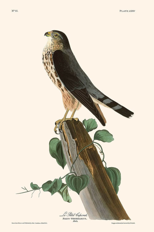Le Petit Caporal, conosciuto oggi da Merlin, creato dal leggendario John James Audubon, è un'illustrazione di uccelli distintiva pubblicata per la prima volta nel 1827 come parte della sua monumentale opera, "Birds of America". Questo pezzo squisito incarna la dedizione di Audubon a rappresentazioni dettagliate e realistiche dei soggetti aviani, offrendo uno sguardo affascinante sulle meraviglie ornitologiche del Nord America all'inizio del XIX secolo.