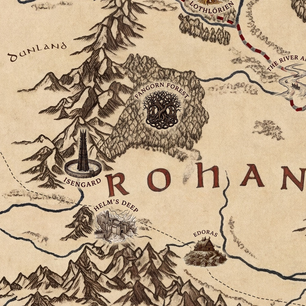 Qui la geografia diventa personaggio. L’Eriador si dispiega verso occidente nei familiari campi dello Shire, con Hobbiton annidata come un seme luminoso di casa. Le Montagne Nebbiose si ergono come una barriera merlata, i loro valichi prefigurando pericoli per i viandanti diretti a est. L’Anduin—il Grande Fiume—scorre verso sud come la spina dorsale liquida della composizione, guidando lo sguardo verso i signori dei cavalli di Rohan e le roccaforti di pietra e tradizione di Gondor. Oltre, Mordor oscura l’orizzonte, annunciata dal suo aspro rilievo e dalla mano gestuale ed espressiva della mappa. Il Rhovanion, ampio e carico di storia, bilancia il tableau, ricordando all’osservatore che il dramma della Terra di Mezzo riguarda tanto le distanze e le divisioni quanto gli eroi.