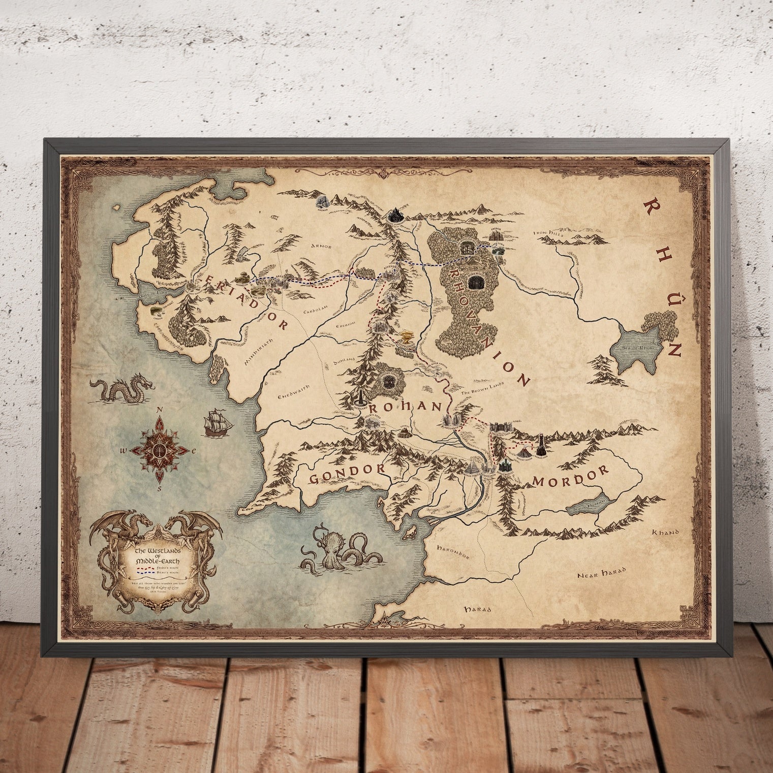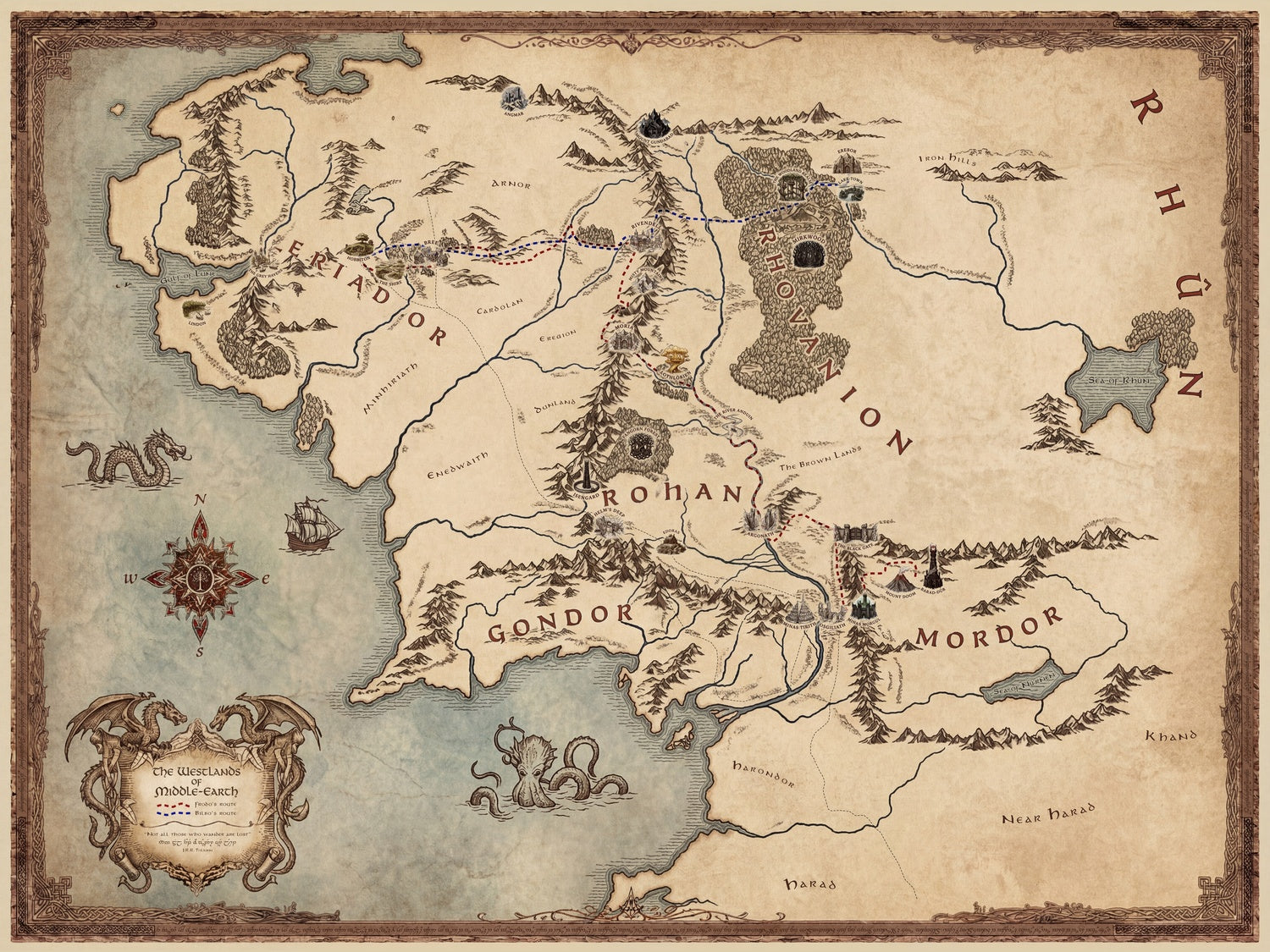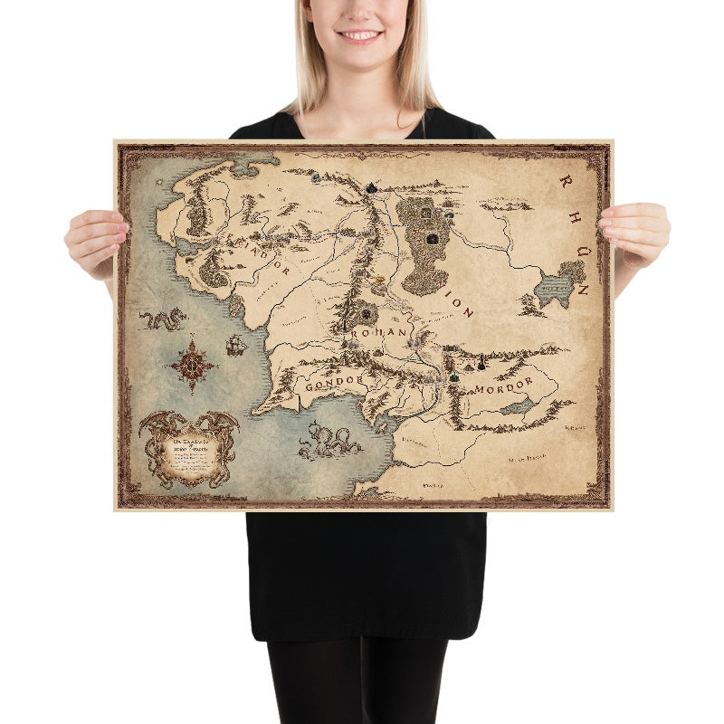 Ogni ornamento premia uno sguardo lento. L’elegante cartiglio incornicia il titolo come una proclamazione; emblemi di bussole e delicati accenti in stile rhumb conferiscono un’atmosfera da teatro della navigazione; e i giocosi mostri marini sussurrano dei confini ignoti oltre le terre mappate. Illustrazioni a mano della Contea, di Rohan, Gondor e Mordor hanno un peso emotivo, ciascuna resa per rispecchiarne il temperamento narrativo—pastorale, marziale, nobile e sinistro. Il trattamento fantasioso di foreste, fiumi e catene montuose eleva la mappa da riferimento a reliquiario, trasformando i viaggi canonici in una coreografia di linee ed emblemi. La scrittura elfica che adorna la cornice decorata.