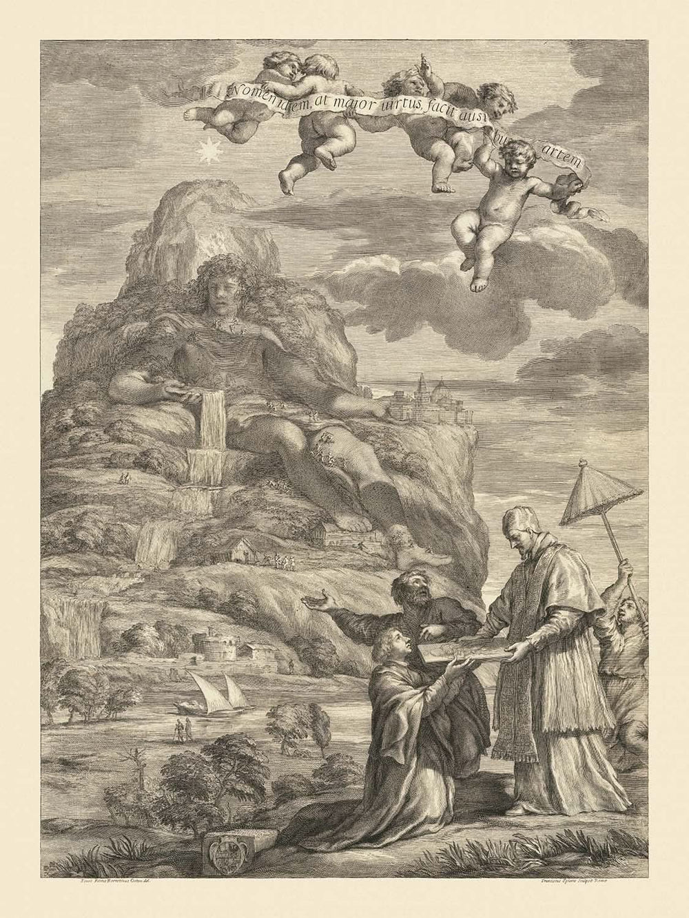 François Spierre, un rinomato incisore del XVII secolo, cattura la grandezza del mito e della storia in quest'opera, mostrando la sua esperienza in incisioni elaborate. Questo pezzo presenta una scena in cui Alessandro Magno, simbolicamente plasmato nella montagna, tiene una città e versa fiumi nel mare. Questa narrativa è un potente omaggio alle ambizioni dei sogni architettonici antichi, dettagliati da Vitruvio.