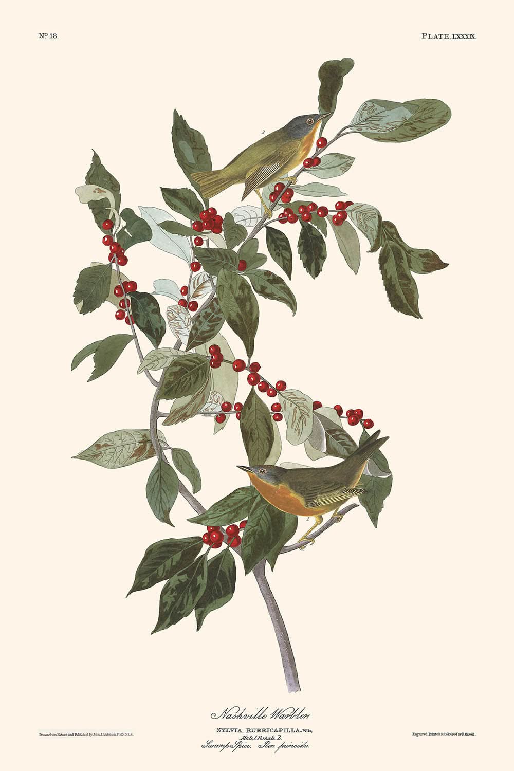 Il Nashville Warbler di Audubon è una rappresentazione squisita sia dell'arte che dell'expertise ornithologica. Inizialmente, Audubon incontrò solo alcuni esemplari in luoghi come Louisiana e Kentucky. Ha dato vita alle sue osservazioni in questo uccello minuto con una superba attenzione ai dettagli—dalle sue piume superiori marrone-verdi al sorprendente verde-giallo sottostante, e un accenno di distintivo rosso scuro sulla corona del maschio. La sua rappresentazione artistica include anche elementi del suo habitat naturale, come il pepe di palude (Ilex prinoides), aggiungendo interesse botanico.
