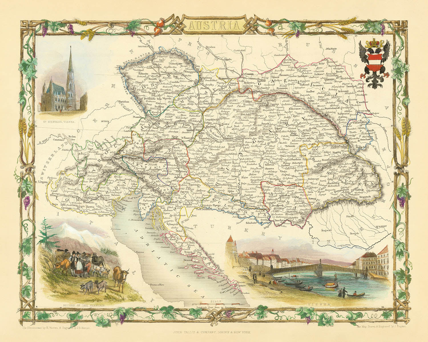 John Tallis, celebrato come uno degli ultimi grandi cartografi decorativi, ha infuso le sue opere sia di precisione scientifica che di estro estetico. Le sue mappe sono venerate per il loro armonioso intreccio di geografia dettagliata e vignette evocative, e questo pezzo non fa eccezione. Qui, Tallis cattura l'intricato arazzo dell'Impero Austriaco, mostrando la sua vasta rete di province, ciascuna rappresentata con attenzione ai confini storici e al carattere regionale. Il suo caratteristico bordo decorativo e le lussureggianti illustrazioni elevano la mappa da semplice strumento di navigazione a opera d'arte.