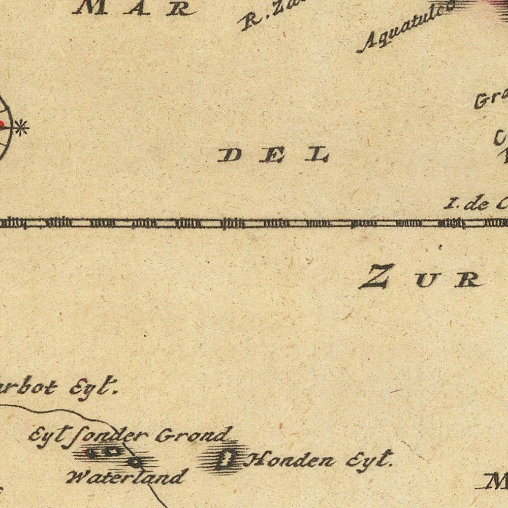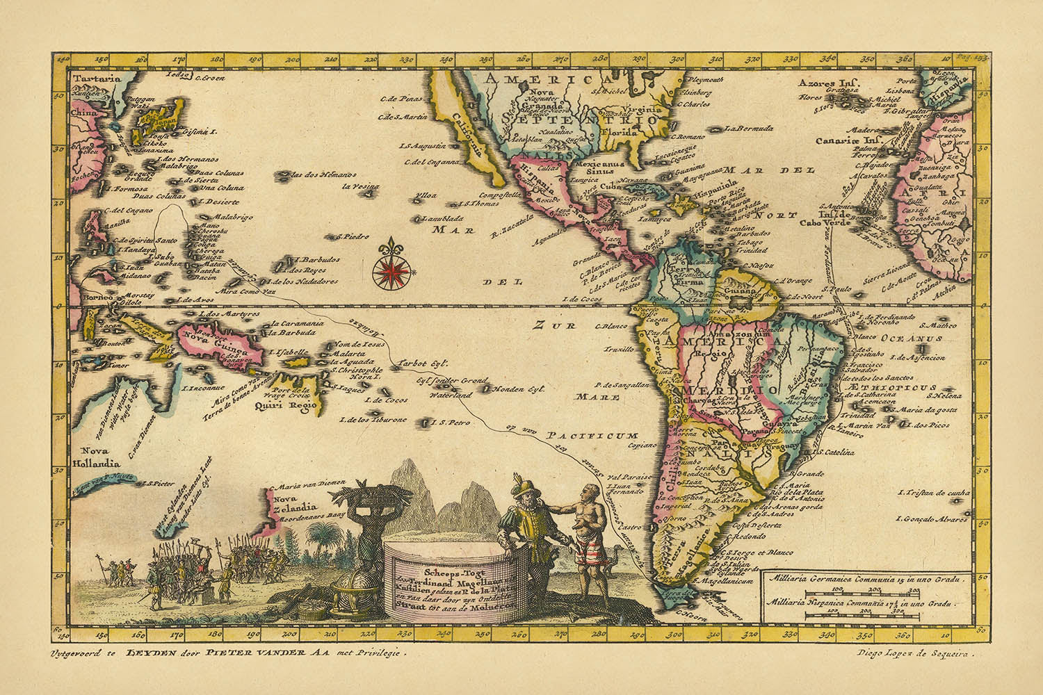 The voyage route is traced with unwavering clarity: an oceanic thread that descends the South American coast before threading the perilous narrows of the Straits of Magellan and sweeping westward across the Pacific to the archipelagos of Southeast Asia. Magellan’s death in the Philippines is implicit in the way the line presses onward—history completed by his second in command, Juan Sebastián Elcano, whose return sealed the first circumnavigation. Around this path, van der Aa stages illustrative encounters between Europeans and indigenous peoples, visualizing curiosity, tension, and exchange. Spain, Portugal, the Americas, and the Malay Peninsula appear as linked theaters in a single, transoceanic drama that echoed far beyond the decks of a handful of galleons.