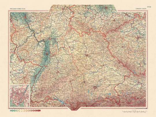 Il paesaggio fisico è anche rappresentato con notevole accuratezza, fornendo un resoconto dettagliato del terreno variegato della regione. Lo stile dettagliato della mappa cattura l'essenza della variegata topografia della Germania meridionale, dalle colline ondulate della Renania-Palatinato alle montagne impervie della Baviera. Questa rappresentazione del paesaggio fisico, insieme ai confini politici, offre una vista completa della regione, rendendo questa mappa una risorsa preziosa per coloro che sono interessati al panorama geografico e politico della Germania meridionale.