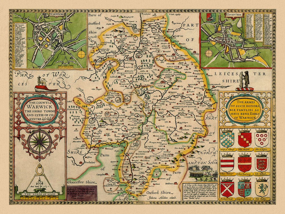 Nell'angolo in alto a sinistra c'è un'incisione dettagliata di Warwick, allora (e ancora) la capitale di questa antica contea. In alto a destra c'è una bella incisione di Coventry, o Coventree come veniva chiamata allora.