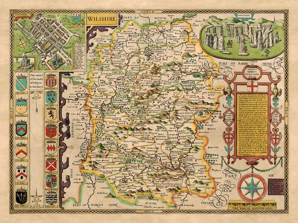 La maggior parte delle città e dei paesi più popolosi di Wiltshire erano già esistenti nei primi anni del 1600. Ecco alcuni dei luoghi chiaramente visibili in questa vecchia mappa della contea di Wiltshire: Swindon, Salisbury, Trowbridge, Chippenham, Melksham, Devizes, Warminster, Calne, Westbury, Corsham, Wroughton, Wootton Bassett, Amesbury, Tidworth, Bradford-upon-Avon, Marlborough e molti altri. Ma naturalmente, molti di essi sono scritti nelle loro forme in inglese moderno precoce.