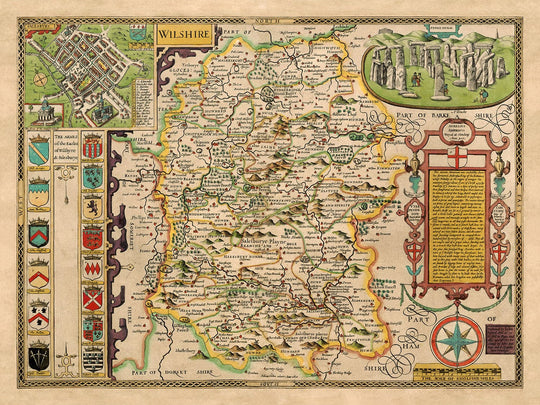 Molti dei paesi, villaggi e città nella contea di Wiltshire nel sud-ovest dell'Inghilterra sono già visibili in questa mappa. Nell'angolo in alto a sinistra c'è un'incisione dettagliata di Salisbury, allora (e ancora) la capitale di questa antica contea. In alto a destra c'è una bella incisione di Stonehenge con alcune persone ben vestite che passeggiano intorno.
