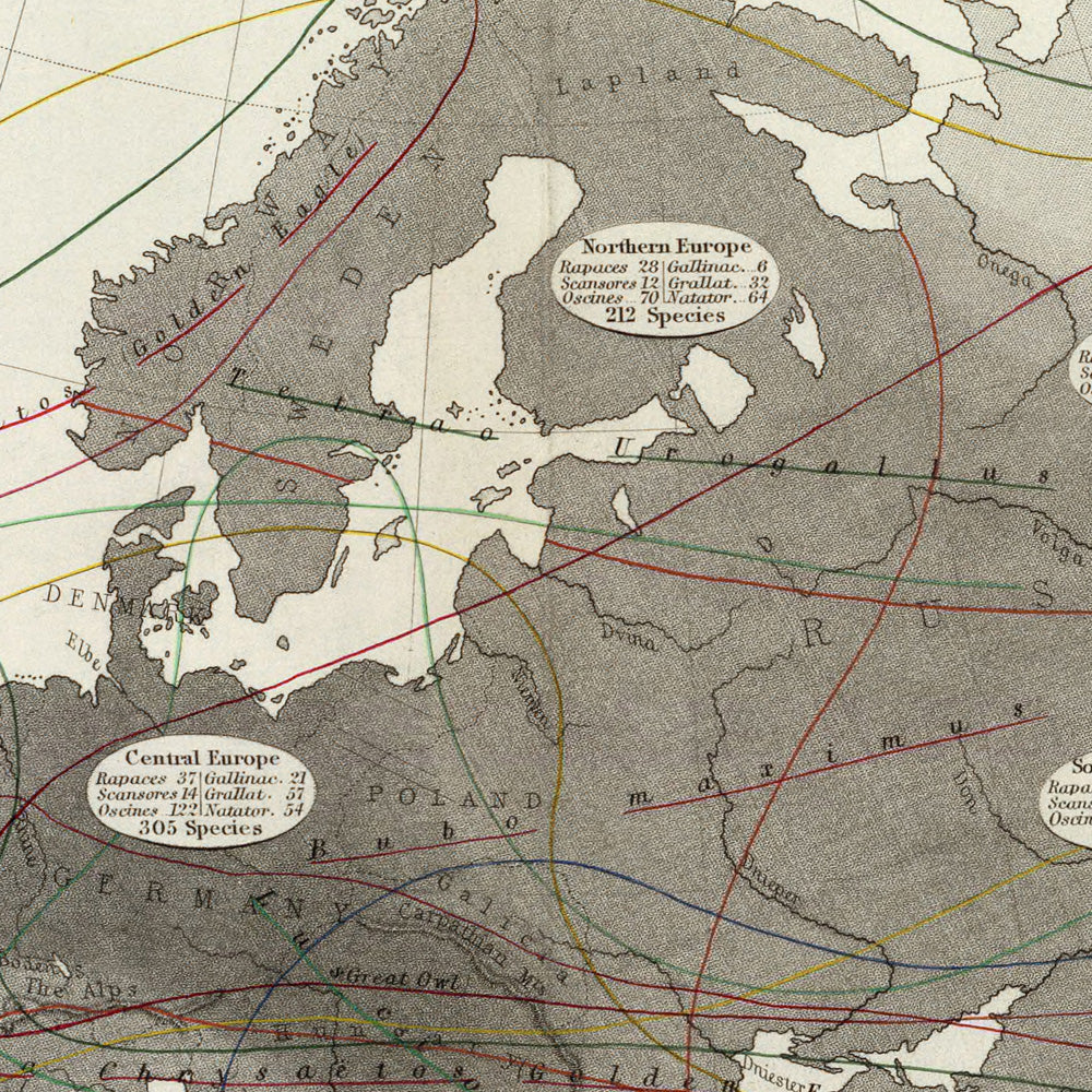 - Regions: Specific European countries featured in the chart of birds, and significant areas indicated through the distribution lines.