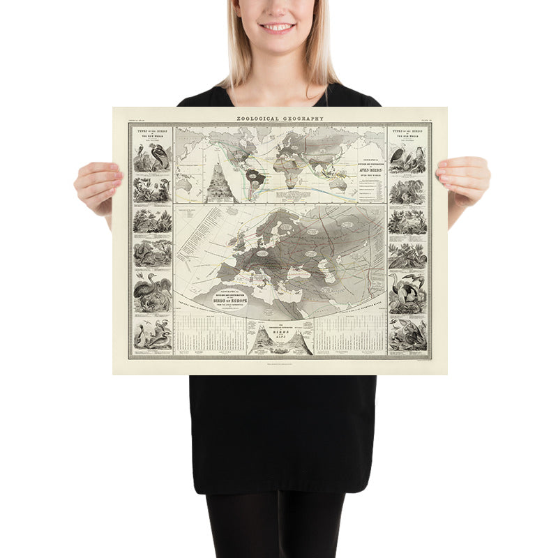 Old World Map of Bird Distribution by Johnston, 1856: Biogeographic zones, European birds chart