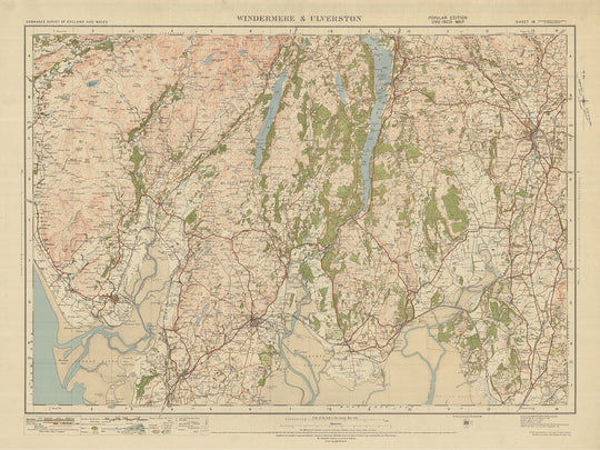 Questa vecchia mappa, intitolata "Foglio 19 - Windermere & Ulverston," è parte dell'edizione "Popolare" della One-inch dell'Ordnance Survey dell'Inghilterra e del Galles, pubblicata nel 1925. Fornisce uno sguardo affascinante sul paesaggio e sulle caratteristiche della regione di Windermere e Ulverston durante quel periodo. La mappa mostra varie città, paesi e punti di riferimento interessanti, tra cui Dalton-in-Furness, Millom, Grange-over-Sands, Kendal e il rinomato Parco Nazionale del Lake District.