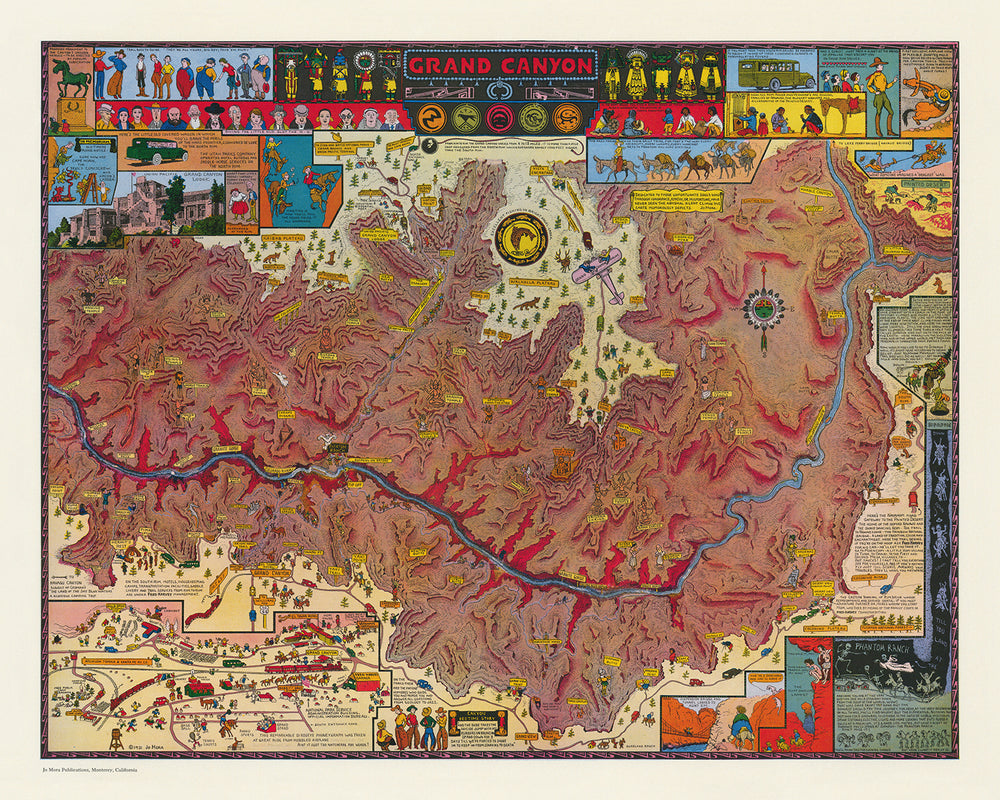 Immergiti nella ricca storia e nella bellezza mozzafiato del Grand Canyon con la Mappa Pittorica del Grand Canyon di Jo Mora, realizzata nel 1931. Questa straordinaria mappa è un capolavoro visivo che offre un'esplorazione dettagliata e fantasiosa di una delle meraviglie naturali più iconiche del mondo. Jo Mora, un artista rinomato per le sue mappe intricate e illustrative, ha catturato l'essenza del Grand Canyon attraverso una serie di meravigliosi vignettes, raffigurando i principali punti di riferimento e gli elementi storici che rendono questa regione così affascinante.