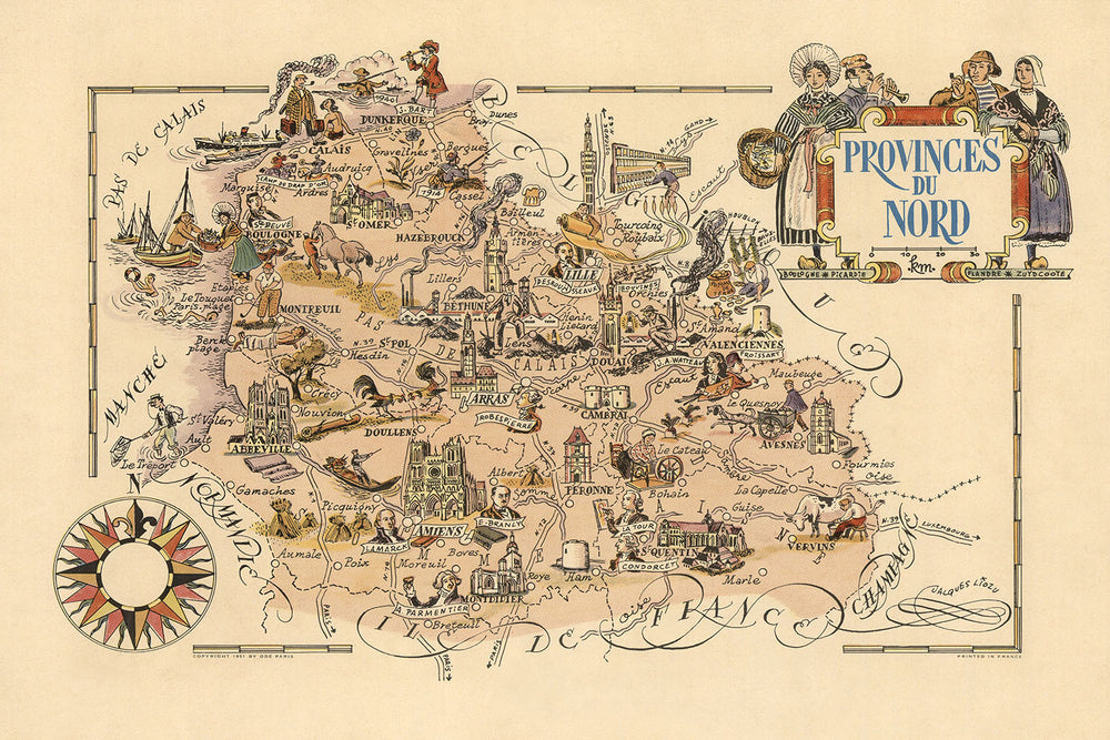 La mappa delle "Provinces du Nord", realizzata dal rinomato Jacques Liozu nel 1951, è un'abile fusione di arte e cartografia, catturando l'essenza del Dipartimento del Nord in Francia. Questa mappa è un vivido arazzo del ricco patrimonio culturale e storico della regione, meticolosamente illustrata con una rosa dei venti decorativa e un rilievo pittorico. L'opera di Liozu è rinomata per i suoi dettagli intricati e gli elementi tematici, rendendo questa mappa non solo uno strumento di navigazione ma una narrazione visiva dell'identità della regione del Nord.