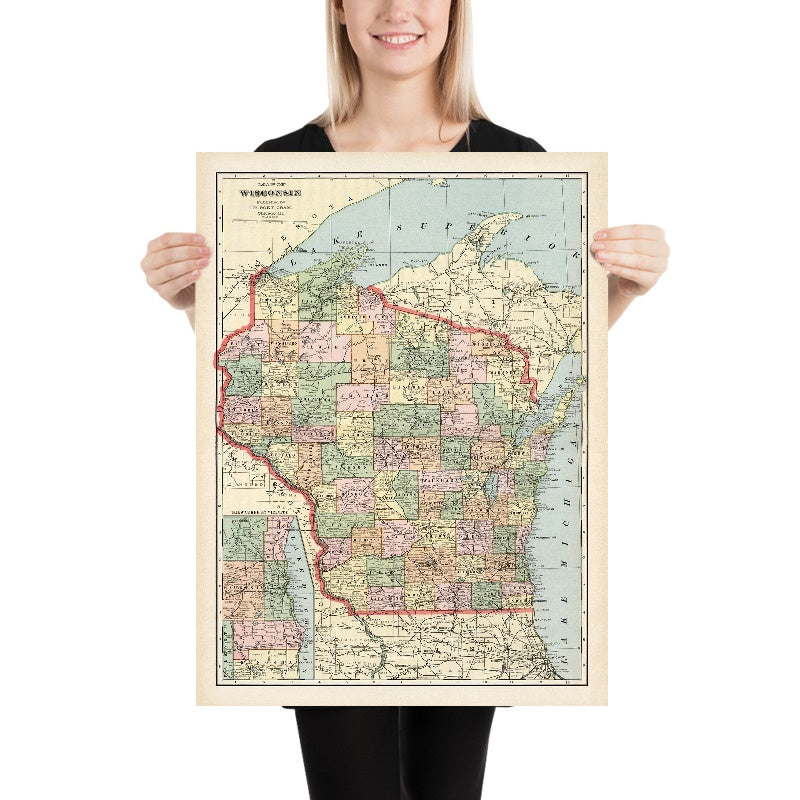 Rare Old Railroad Map of Wisconsin by Cram, 1901: Milwaukee, Madison, Green Bay, Lake Michigan, Mississippi River