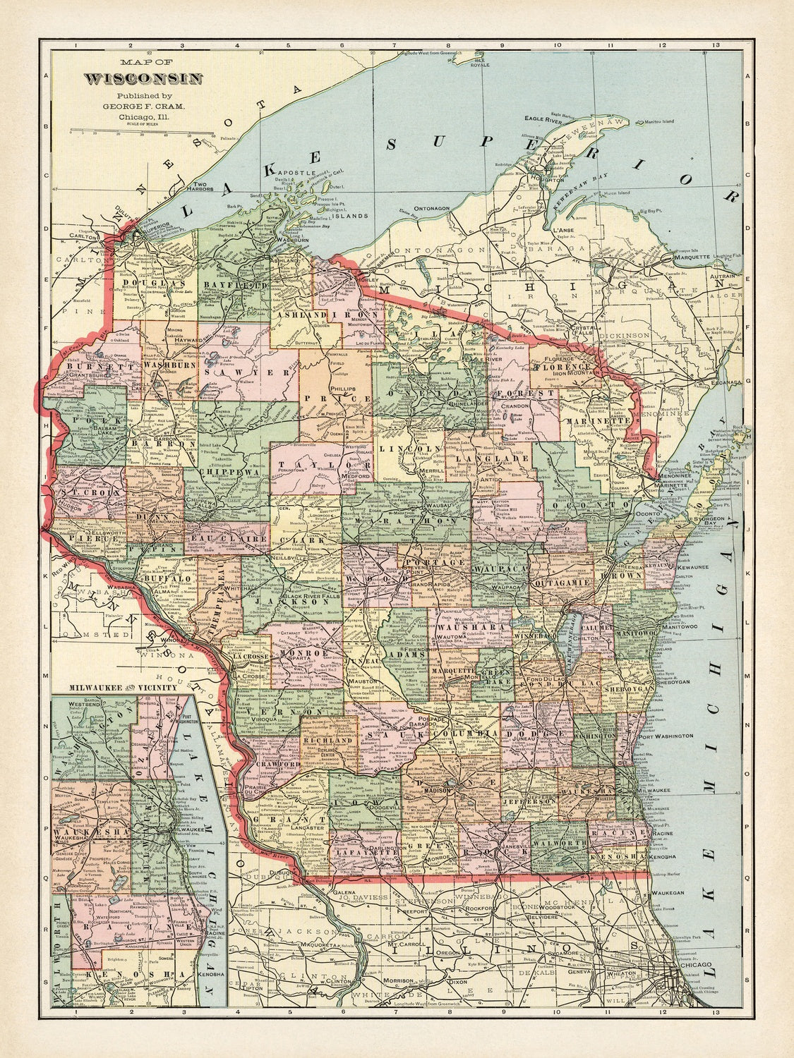 Map of Wisconsin is George F. Cram’s 1901 portrait of the Badger State, issued from his Chicago press for the census revision of his celebrated Atlas of the World, Ancient and Modern. True to Cram’s reputation, the sheet balances precision with verve: counties are distinctly color-banded in refined pastels, an ornate border frames the composition, and a crisp cartographic key decodes symbols and linework. Longitude is set from Greenwich, placing Wisconsin within a confidently global frame even as the map focuses on local exactitude. Produced at the turn of the century, it captures the state at a moment when railroads, county governance, and market towns structured civic life, and when Cram’s atlases—equally at home in classrooms, boardrooms, and survey offices—defined the visual language of American geography.