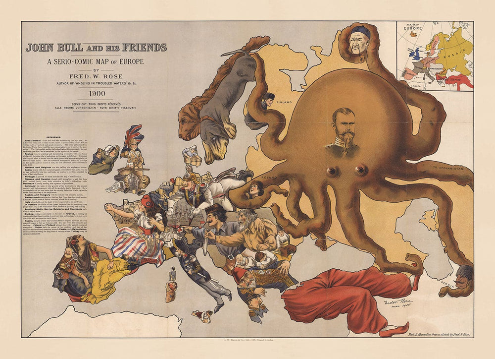 Mappa satirica antica dell'Europa, 1900 di Fredrick Rose: Propaganda serio-comica di John Bull, Octopus Nikolai II Impero Russo