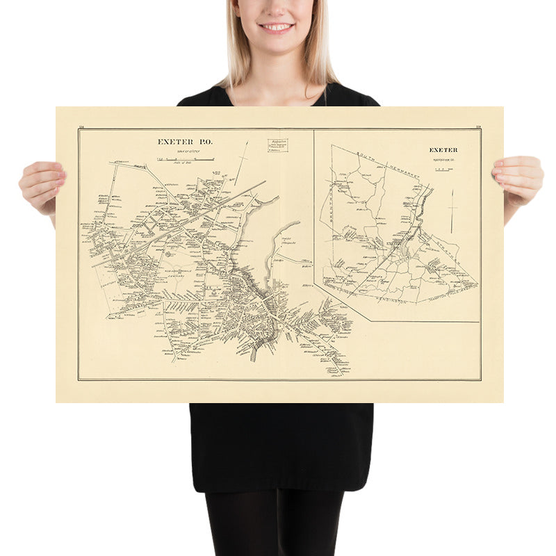 Exeter P.O., town of Exeter — the understated, workmanlike title belies the sophistication of this 1892 lithographed portrait of Rockingham County’s storied river town. Issued by the Boston publishers D.H. Hurd & Co., it presents Exeter with the clarity and composure characteristic of the best late nineteenth‑century cartography: streets crisply ruled, waterways elegantly traced, institutions and businesses labeled with an editor’s care. Hurd’s distinctive graphic taxonomy—public and commercial buildings shaded one way, private residences another—turns the townscape into an instantly legible narrative of work, worship, learning, and home. A carefully placed inset extends the viewer’s grasp beyond the center to the surrounding districts and approaches, orienting Exeter within its county setting. Roads are shown decisively, the main thoroughfares reading like arteries of trade, while the marked cemeteries and river bends introduce a quietly human cadence to the geometry. In a single glance, the map delivers a quick understanding of the town’s late‑Victorian layout and its historical context, yet rewards prolonged study with a wealth of labeled detail.