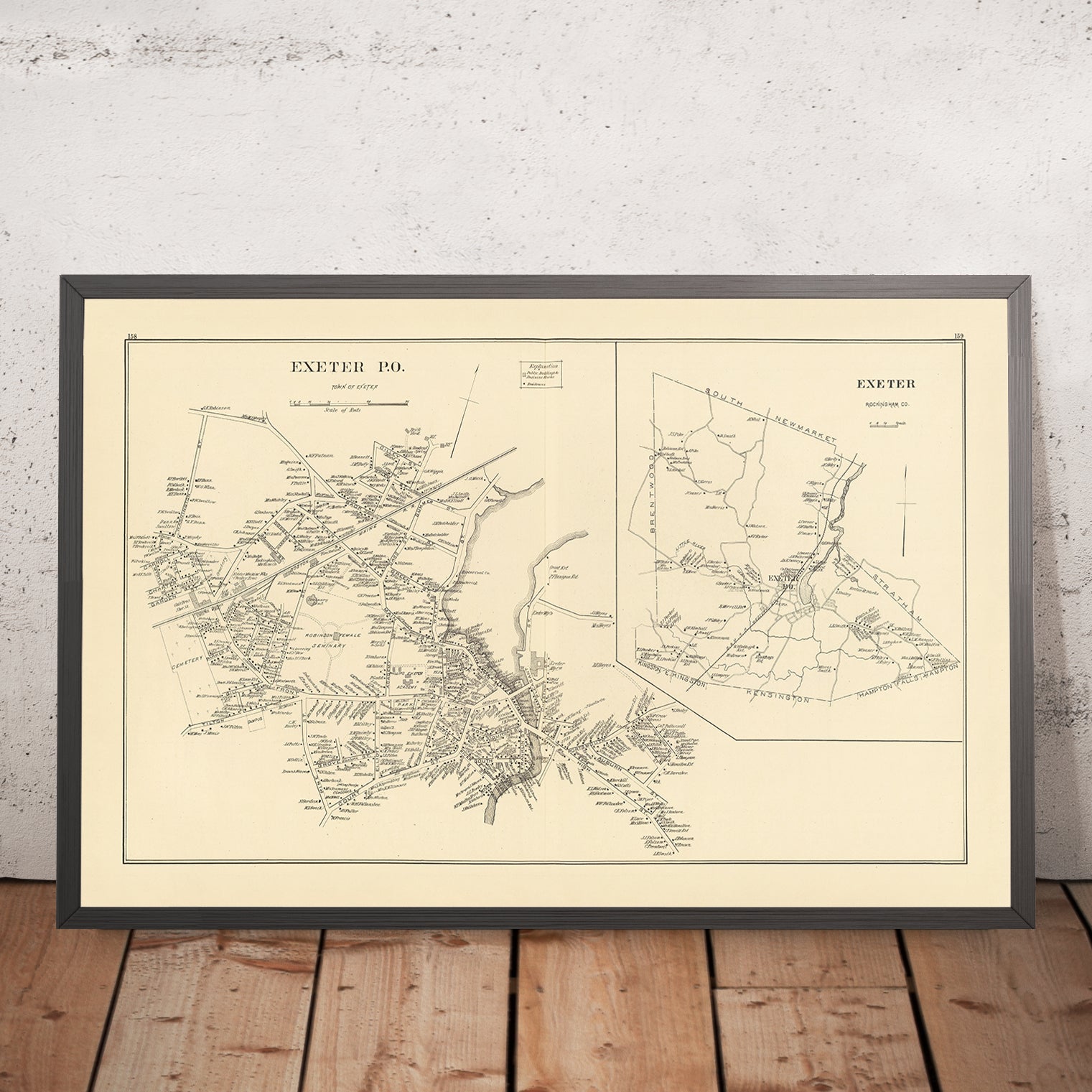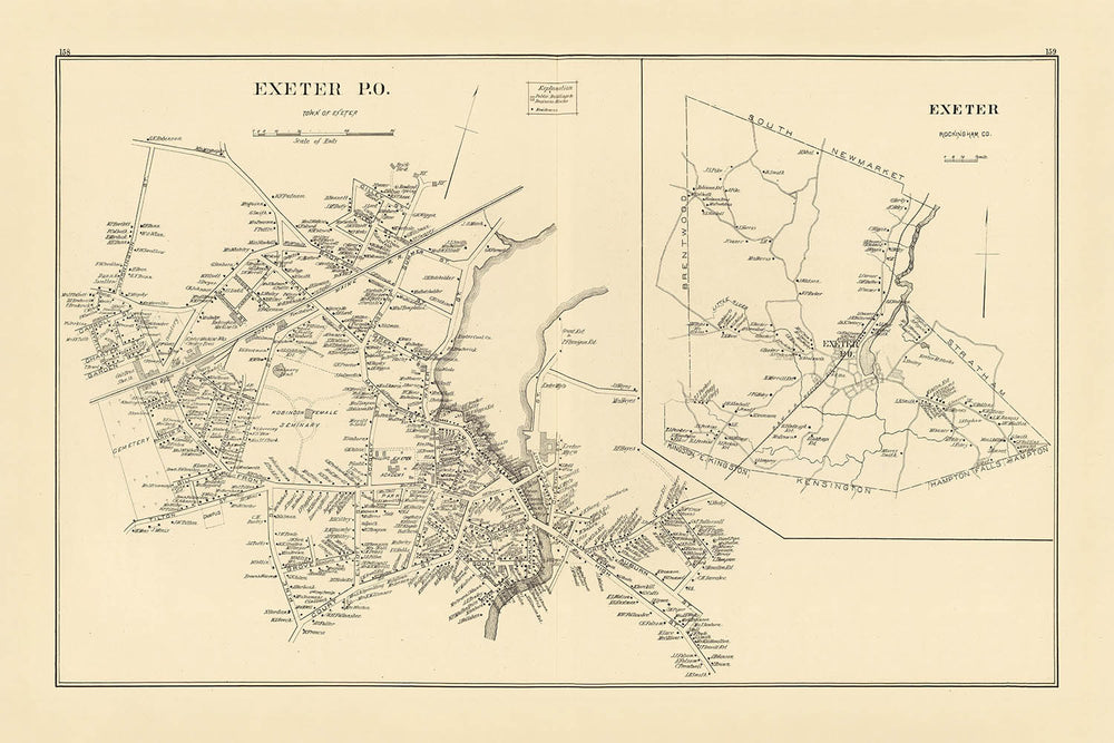 Read as a historical document, the map offers scholars and collectors a rare, coherent snapshot of how a thriving New Hampshire town understood itself in 1892. The inset widens the lens to neighboring hamlets and road junctions, showing how Exeter’s influence radiated into Rockingham County’s farms, mill‑villages, and the tidal reaches that connect inland to the coast. The precise labeling of institutions and yards captures patterns of land use and proprietorship that underpin genealogical research and urban history alike, while the presence of cemeteries and waterways records the moral and economic geometries of the age. Above all, the composition exemplifies the late‑Victorian pursuit of clarity—elegance in service of legibility—so that every street, school, and shop reads as part of a comprehensible whole. It is both a guide and a portrait: a calm, confident visualization of Exeter at a moment when commerce, education, and civic life aligned to give the town its enduring shape.