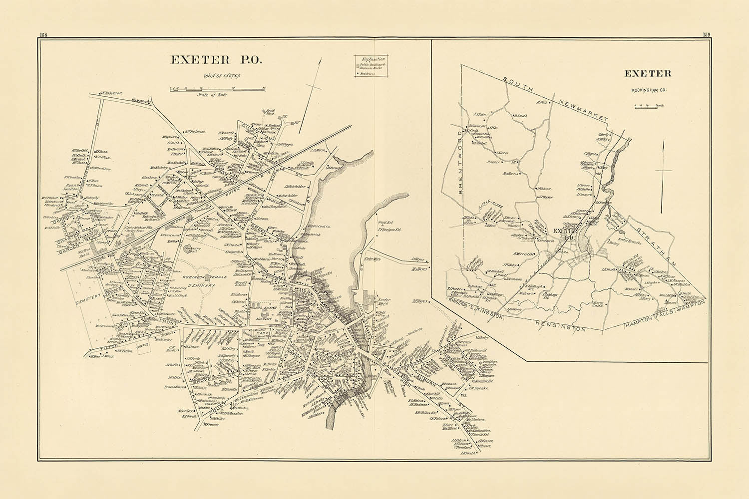 This plate also distills the economic and social forces that shaped Exeter in the late nineteenth century. The shading that distinguishes public buildings points to a civic infrastructure thick with town halls, libraries, churches, and schools—those emblems of New England pride that undergirded prosperity. Commerce was buoyed by rail and road networks that linked the town to Boston and the broader markets of the Northeast; maps of the era typically mark depots and corridors as vital conduits of goods and people. Industry still leaned on waterpower, yet the urban footprint hints at diversification: workshops near the river, service trades along the main streets, and cultural institutions occupying dignified precincts. Exeter’s long history—as a colonial seat of governance during the Revolution and, famously, as the home of Phillips Exeter Academy—gives the town a layered identity that maps like this make visible, not by proclamation but by the quiet aggregation of labeled buildings, aligned streets, and purposeful open spaces.