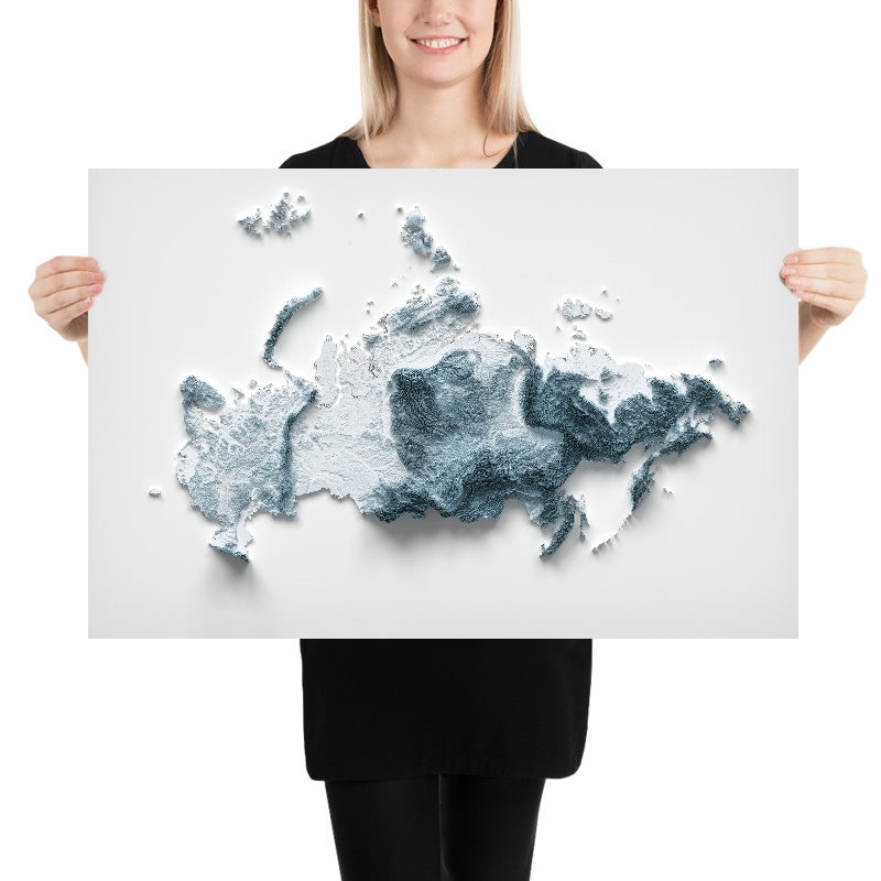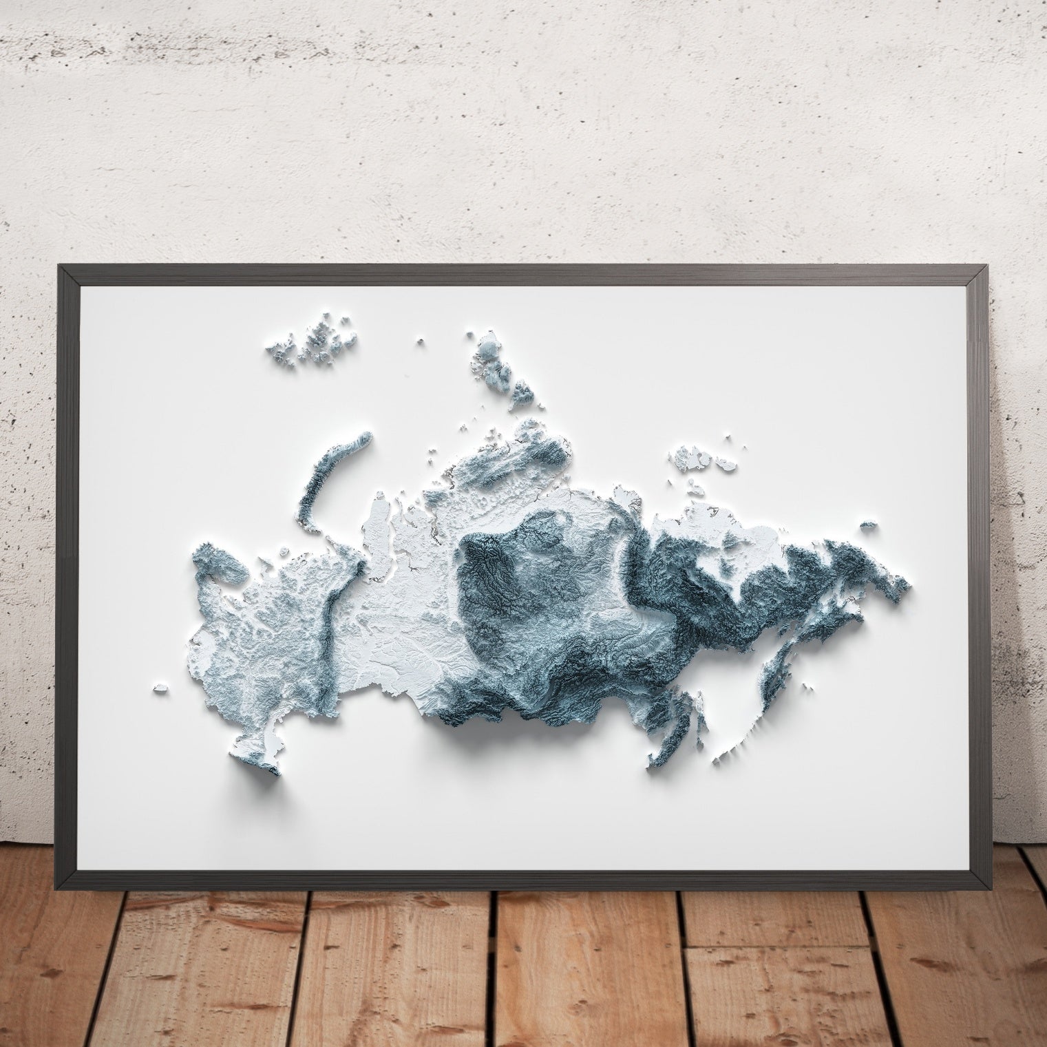 Questa è una mappa topografica minimalista in rilievo della Russia, creata da The Unique Maps Co. e valorizzata dal nostro processo Unique 3D, marchiato. Non ci sono etichette, né strade, né città — solo la terra stessa, riportata in vita mentre luce e ombra scorrono su cime, altipiani e bacini fluviali. Le curve di livello sono nitide, consentendo di leggere a colpo d’occhio l’immensa varietà del Paese, dalle sue pianure europee fino alle sue propaggini pacifiche.