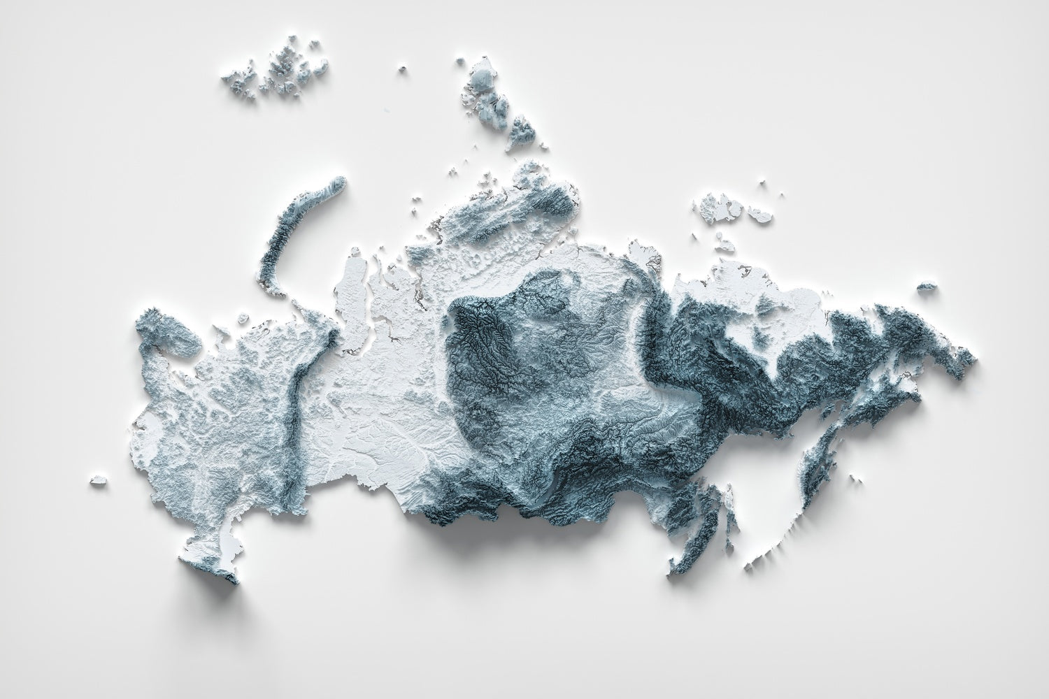 Sul margine del continente, la mappa cattura il selvaggio bordo estremo della Russia: la costa frastagliata del Mare di Ochotsk, i promontori del Mare di Bering e la spina dorsale vulcanica della penisola di Kamčatka. I rilievi conici risaltano con decisione, suggerendo stratovulcani come il Klyuchevskaya sotto forma di piramidi nette di luce e ombra. Gli archi insulari di Sachalin e delle Kurili riecheggiano questo rilievo al largo, mentre verso nord il litorale artico si appiattisce di nuovo in bassa tundra e delta. I monti Byrranga sulla penisola di Taymyr emergono come un solitario bastione corrugato in mezzo alle alte latitudini, e gli altipiani elevati e i campi di ghiaccio dispersi nell’estremo nord si registrano come cime luminose e pendii profondamente in ombra.