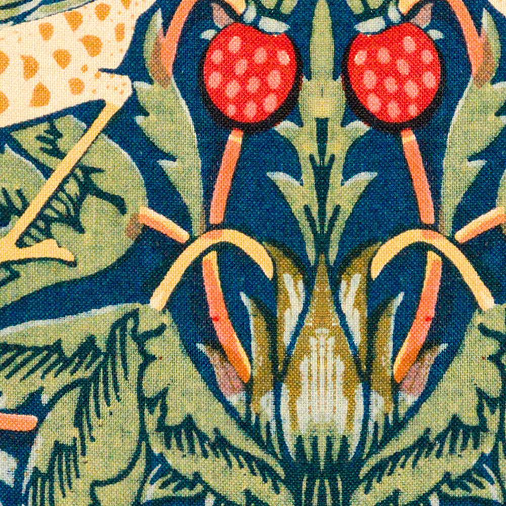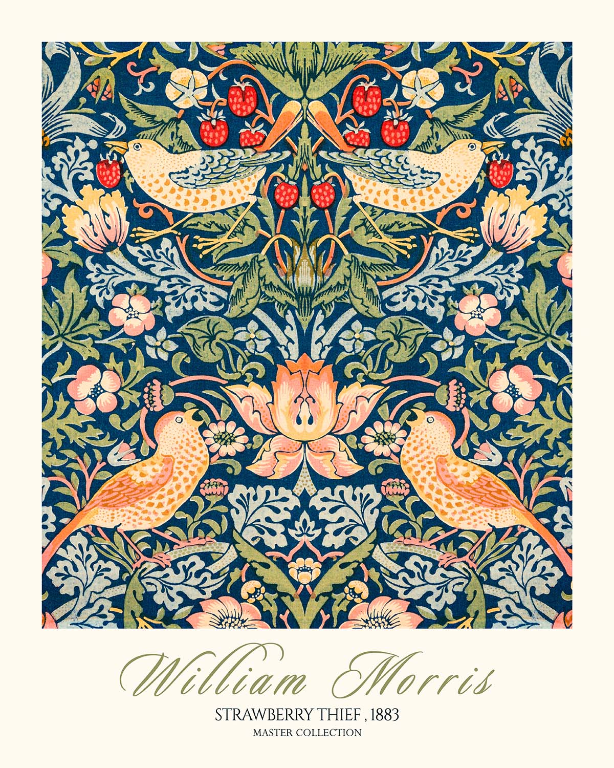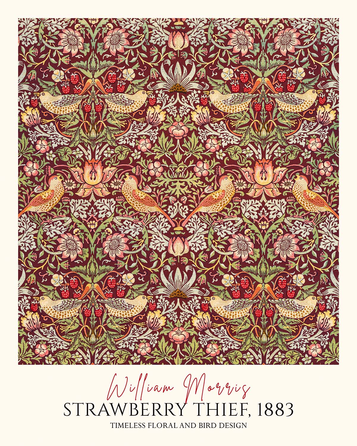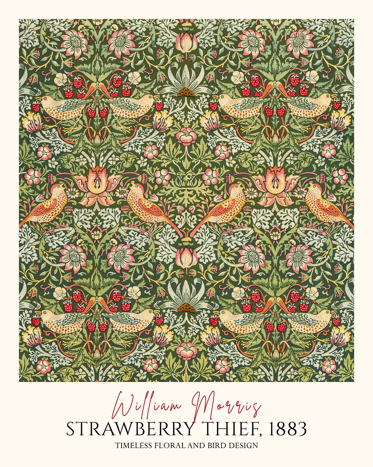 Strawberry Thief by William Morris (1883) is one of the most beloved patterns of the Arts & Crafts movement, a richly detailed celebration of nature translated into a repeating design of birds, fruit, and foliage. Morris’s vision championed beauty in everyday life through meticulous craftsmanship, and this motif—originally created for domestic interiors and widely associated with wallpapers and furnishing textiles—captures that ethos with lyrical, hand-drawn elegance.