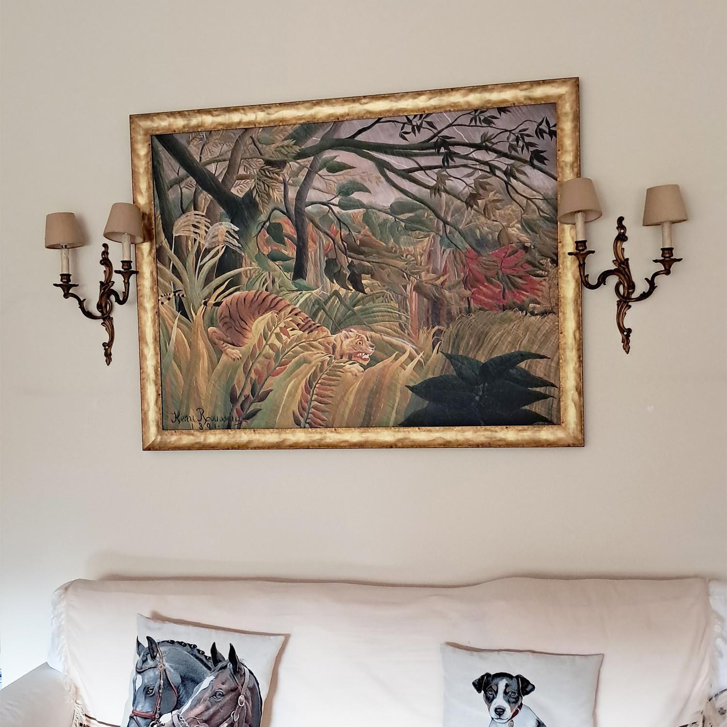 Il modo in cui Rousseau mescola l'immaginario con il realistico, giocando con luce e ombra, cattura un senso di mistero e movimento. Il contrasto tra l'occhio feroce della tigre e lo sfondo di un cielo minaccioso e pioggia torrenziale rende quest'opera un argomento di conversazione e un bellissimo punto focale in qualsiasi stanza.