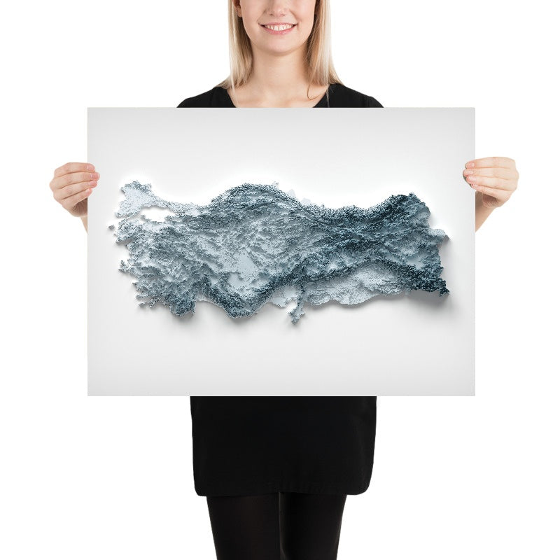 Questa è una carta topografica in rilievo minimalista della Turchia, realizzata da The Unique Maps Co. e valorizzata con il nostro processo Unique 3D, protetto da marchio registrato. Non ci sono etichette, né strade, né città — solo il linguaggio puro delle forme del terreno. La luce sfiora le cime più elevate mentre le ombre si raccolgono in valli e bacini, così da leggere a colpo d’occhio la struttura del paese: una cintura montuosa che circonda ampi altopiani interni, incisi da fiumi che si dirigono verso tre mari diversi.