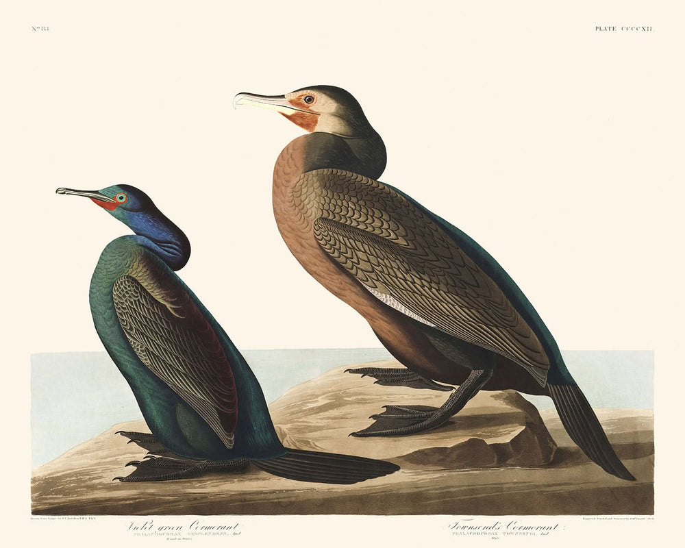 Il Cormorano verde-viola e il Cormorano di Townsend (Tavola 412), magistralmente illustrati da John James Audubon, rappresentano un'opera straordinaria della sua celebre serie, Gli Uccelli d'America. Creata e pubblicata nel 1827, quest'opera cattura la vivida bellezza di queste specie con il caratteristico dettaglio e precisione di Audubon, presentando i cormorani in proporzioni e tonalità realistiche che riflettono la loro eleganza nel mondo reale.