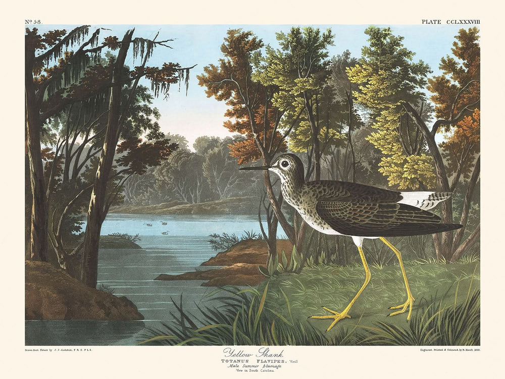 John James Audubon, un rinomato naturalista e pittore, è celebrato per le sue rappresentazioni straordinariamente dettagliate e realistiche degli uccelli, che hanno arricchito la nostra comprensione dell'ornitologia americana. La grande scala della sua opera ha permesso dettagli incredibili, come si vede nel piumaggio vibrante del Yellow Shank e nel ricco contesto ambientale rappresentato in questo pezzo.