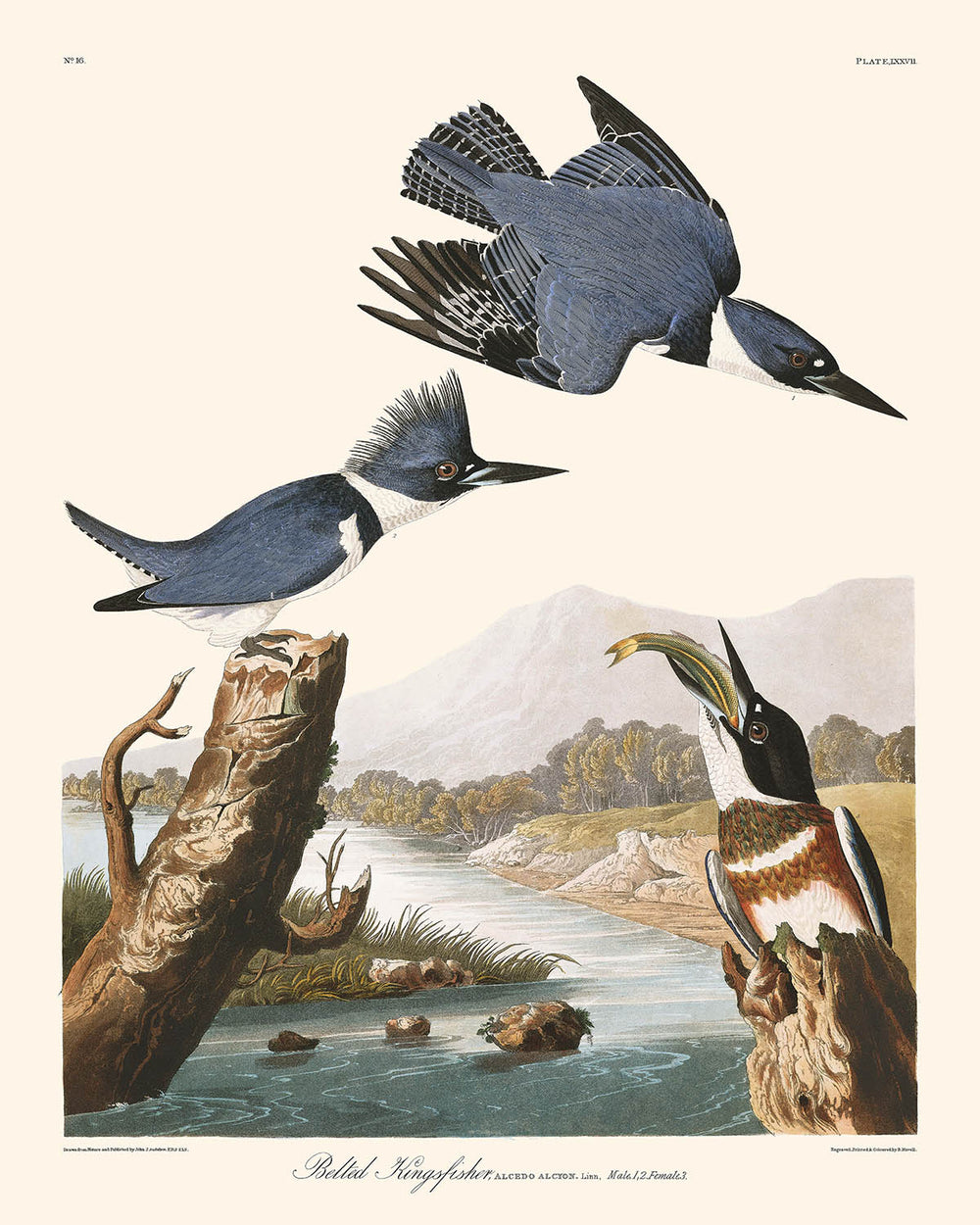 Belted Kingfisher, first published in 1827, is one of the exquisitely detailed bird illustrations from John James Audubon's monumental work, Birds of America. This particular plate captures the majesty and precision of the Belted Kingfisher, a bird observed through meticulous study by Audubon.