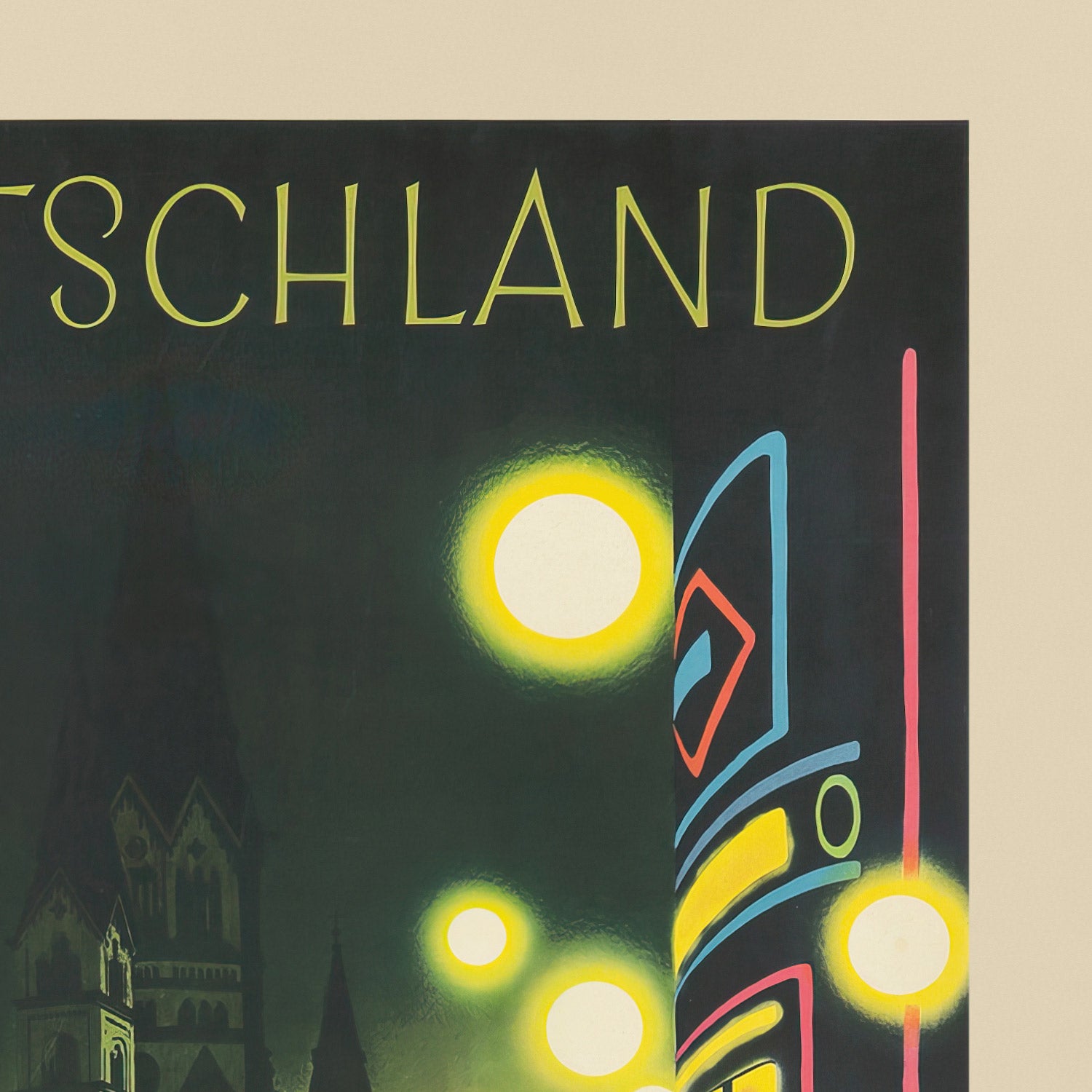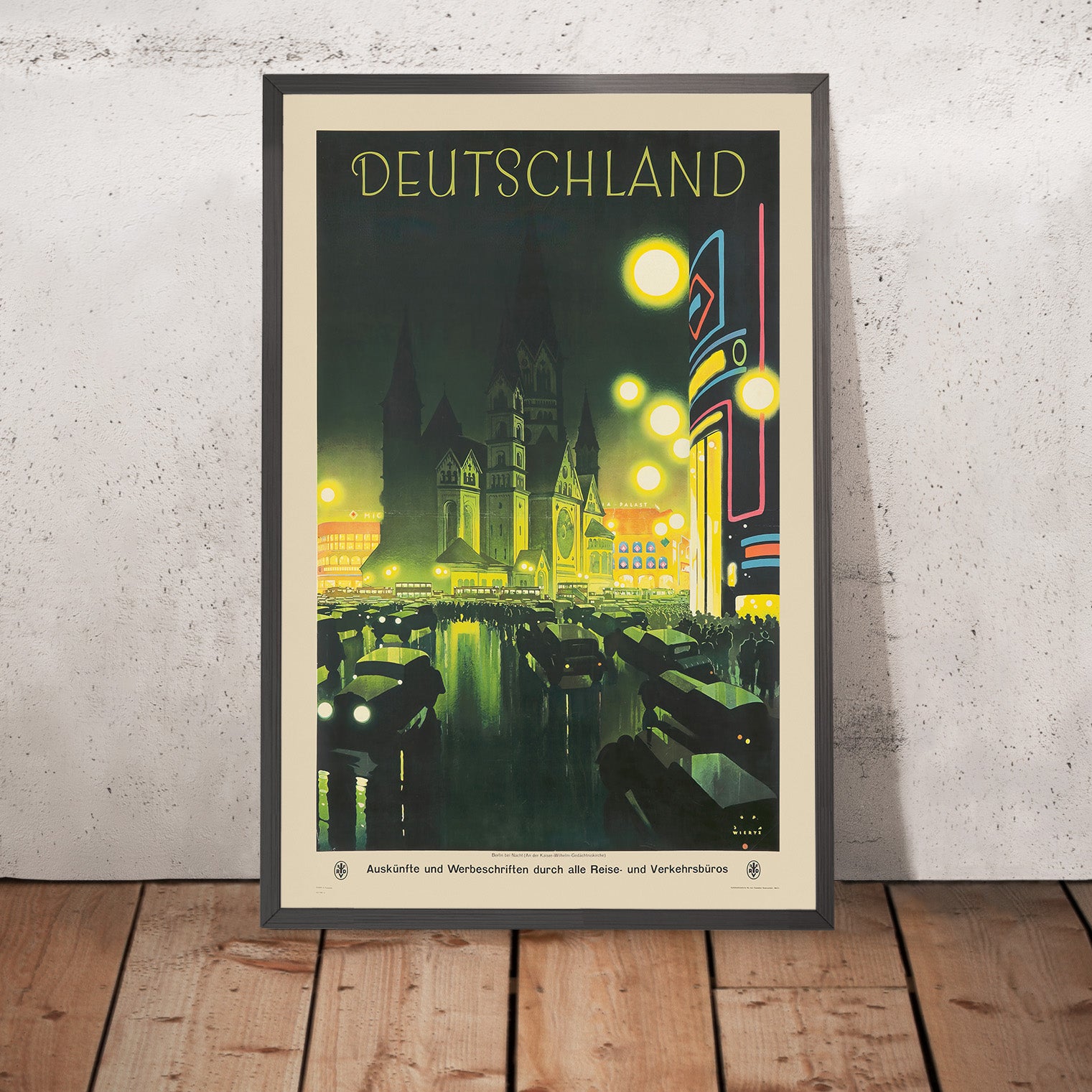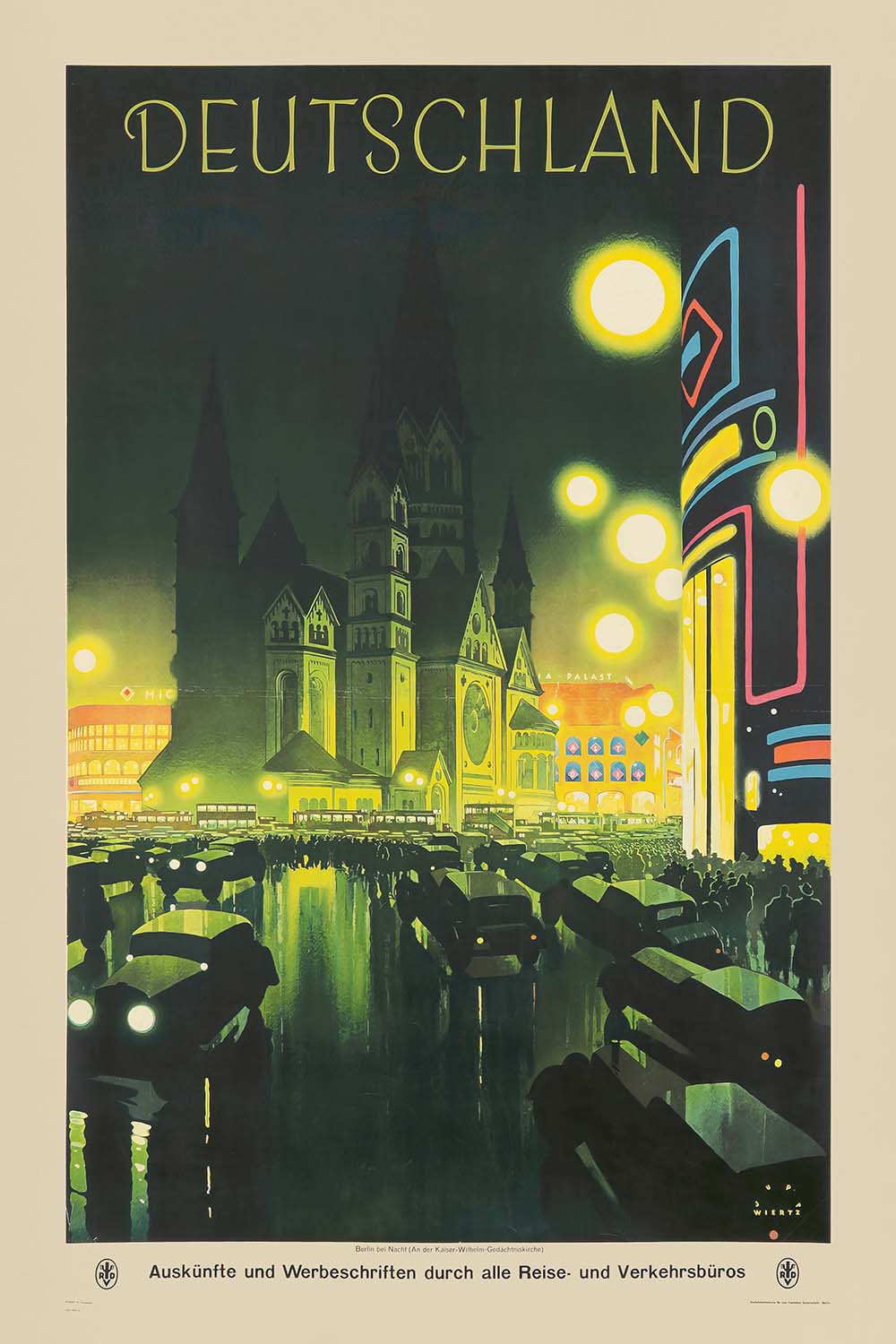 “Deutschland” by Jupp Wiertz (1927) is a luminous celebration of Weimar‑era Germany—specifically Berlin at night. The poster’s subtitle, which appears on the print itself, reads “Berlin bei Nacht (An der Kaiser‑Wilhelm‑Gedächtniskirche),” placing us on the bustling boulevard by the Kaiser Wilhelm Memorial Church. Headlights and streetlamps flare into glowing orbs, neon signage arcs up a modernist corner building, and the church’s dark spire rises like a silhouette against a green‑black sky. The result is both romantic and electrifying: a snapshot of a metropolis in motion.