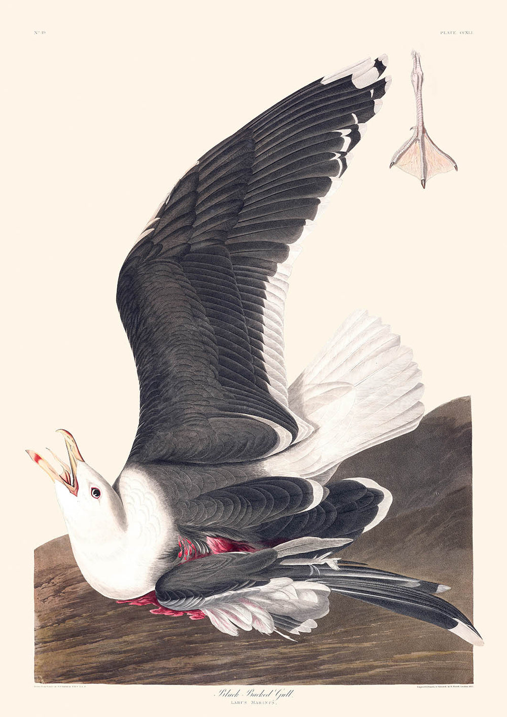 Black Backed Gull is a captivating illustration by the renowned John James Audubon, first published in 1827 as part of his monumental work, The Birds of America. This striking artwork showcases a majestic Black Backed Gull in its natural habitat, capturing both its grace and power.