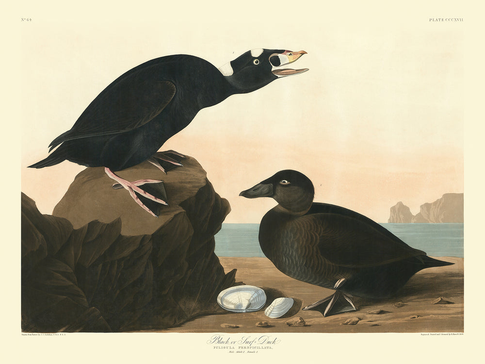 Audubon's work is distinguished not just by its scientific accuracy but by its artistic flair. The meticulous detail of the male Surf Scoter's colorful bill and expressive pose contrasts beautifully with the tranquil demeanor of the female, her plumage blending seamlessly with the sandy shore. This piece captures a serene coastal scene with clamshells scattered by the tide, portraying the natural habits and habitat of these fascinating birds.