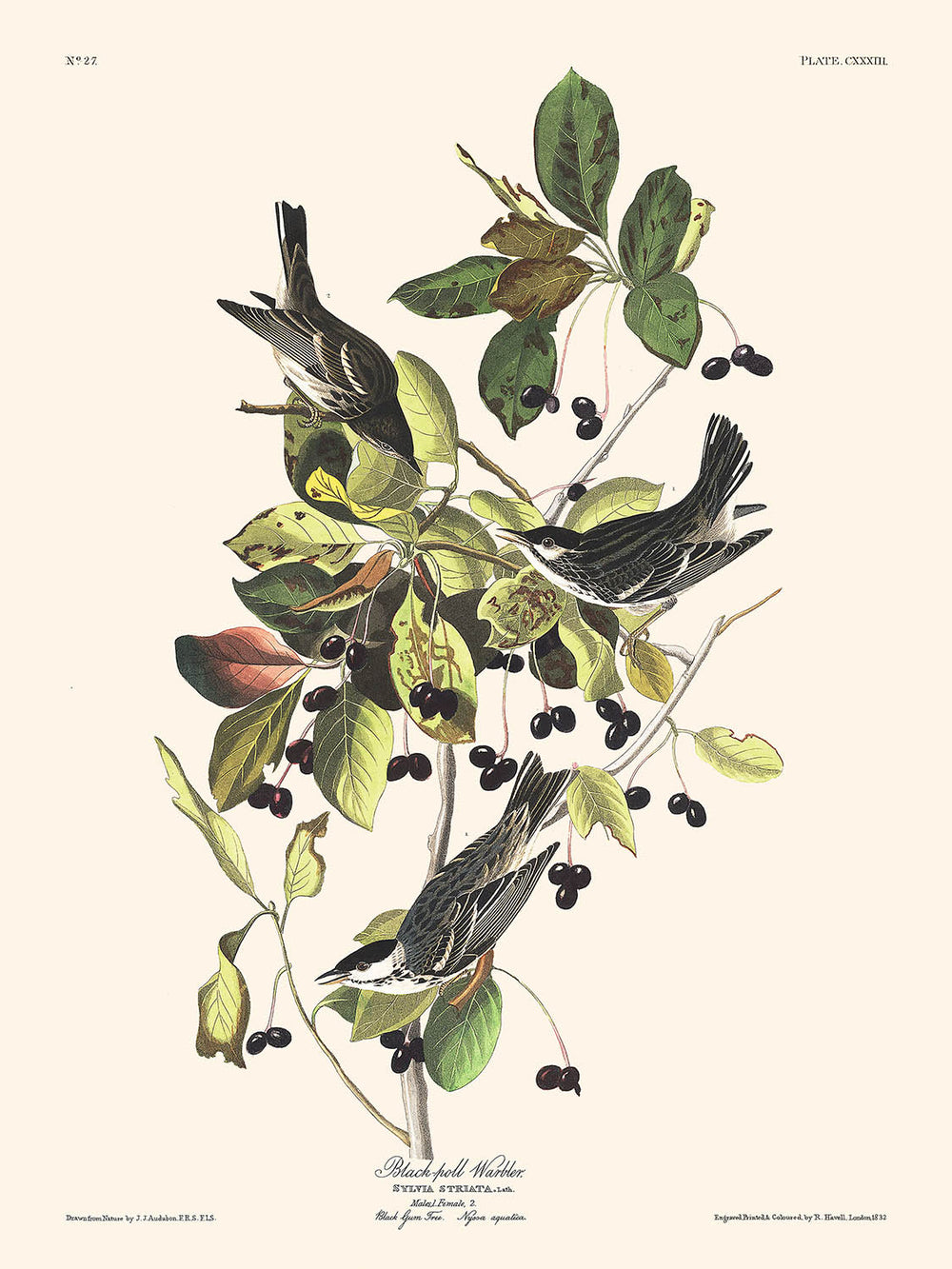 Owning a print of the Black-poll Warbler is like owning a piece of natural history. The vivid colors and meticulous details not only make it a visually stunning addition to any room but also a piece of art that tells a fascinating story about the biodiversity of early 19th century America and Audubon’s extraordinary journey of discovery.