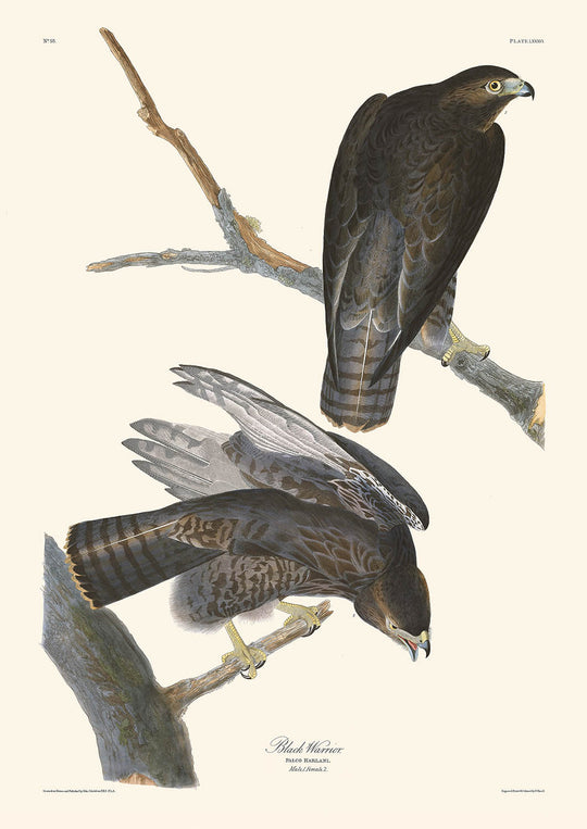 Immerse yourself in the majestic depiction of the "Black Warrior" hawk by the renowned naturalist and painter John James Audubon. First published in 1827, this powerful bird illustration from Audubon's seminal work, "Birds of America," captures the commanding presence and intricate details of this feathered predator.