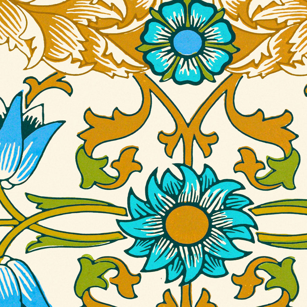 Blue Vine reflects Morris’s conviction that ornament should be both structured and natural. The design’s orderly repeat supports flowing, vine-like arabesques, creating a subtle rhythm that feels at once architectural and garden-fresh. Intended to be lived with every day, the motif exemplifies the Arts & Crafts goal of elevating domestic life through beauty, craft, and thoughtful pattern.