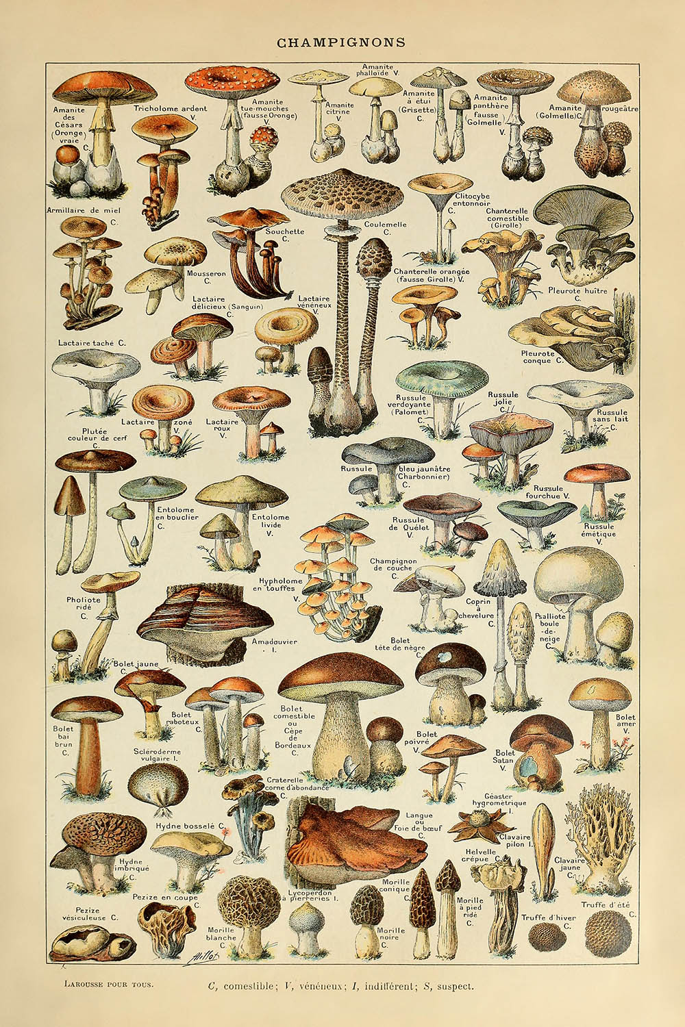 Adolphe Millot's "Champignons," first published in 1890, is an exquisite Victorian botanical illustration that brings the fascinating world of fungi to life. This artwork showcases a wonderful selection of mushroom sketches originally published in "Le Larousse pour tous: nouveau dictionnaire encyclopédique," a masterpiece by Millot. Through these detailed and aesthetically pleasing illustrations, Millot provides a visual feast that highlights the diversity and beauty of mushrooms in the natural world.