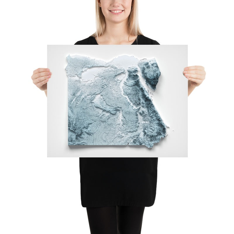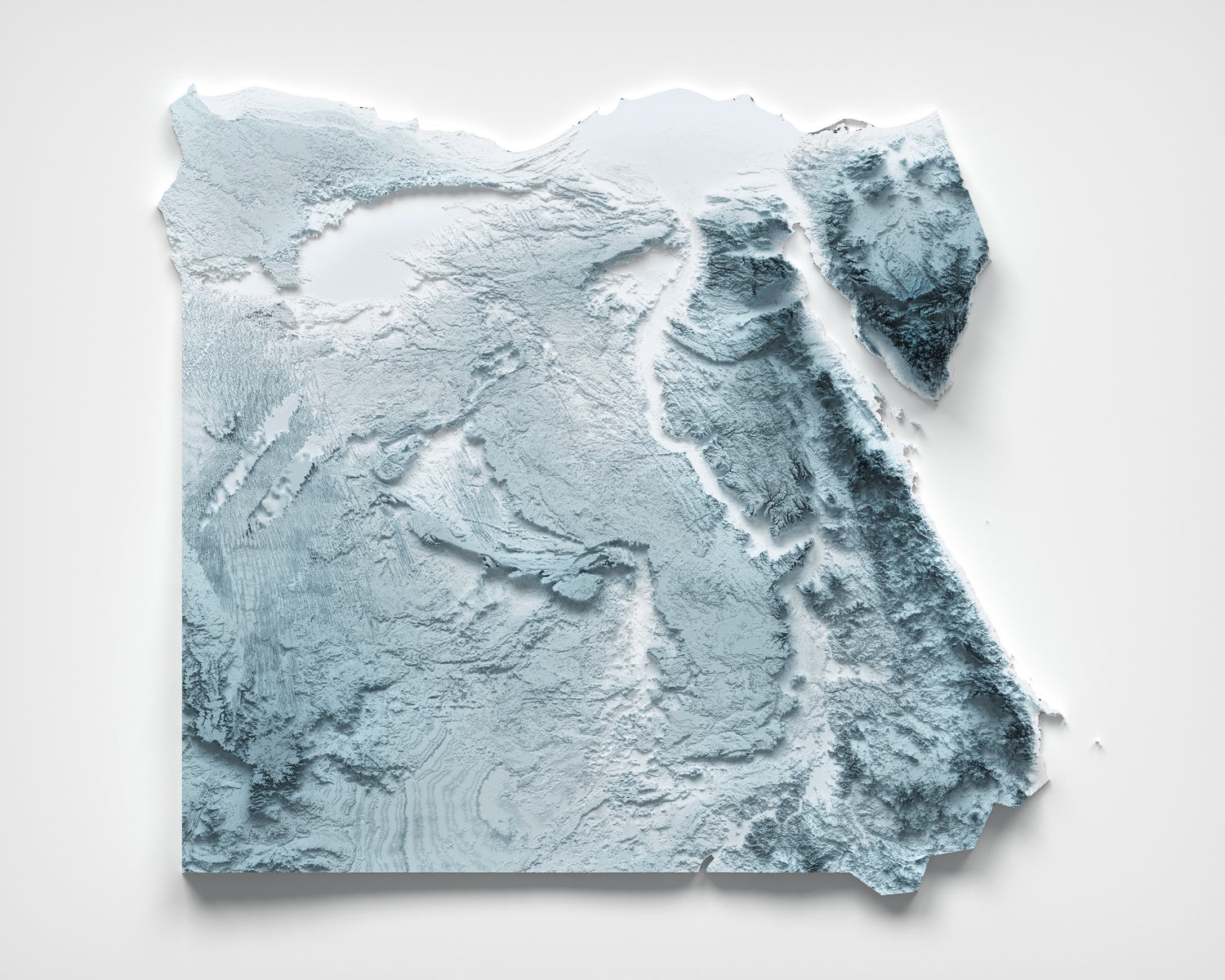 This minimalist topographical relief map of Egypt, crafted by The Unique Maps Co. with our signature Unique 3D process, strips away labels and roads to let the land speak for itself. Subtle light and shadow glide across the surface to reveal high peaks, low valleys, long escarpments and broad basins—an elegant portrait of the country’s ancient geomorphology.