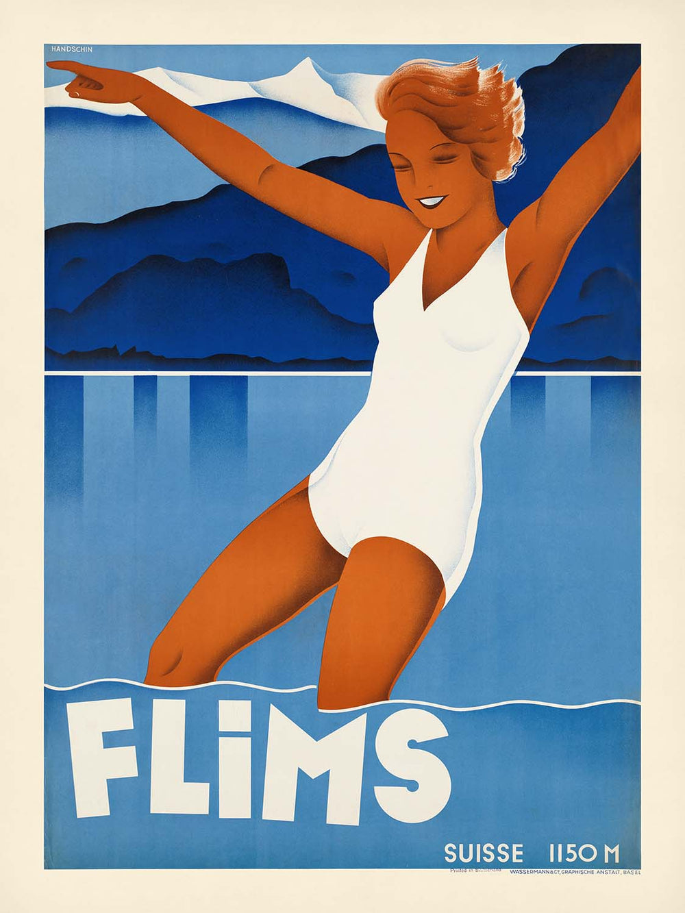 Flims is a classic Art Deco travel poster celebrating the Swiss alpine resort of Flims in the canton of Graubünden—here attributed to an anonymous designer working in the golden age of European poster art. Created in the interwar era when mountain destinations were promoted for fresh air and vigorous leisure, the artwork captures the upbeat spirit of travel between the 1920s and 1930s. Flims, known for its crystalline lakes, forested trails and airy plateau above the Rhine Gorge, became a beacon for hikers, swimmers and sunseekers as well as winter sports enthusiasts—an allure that still resonates today.