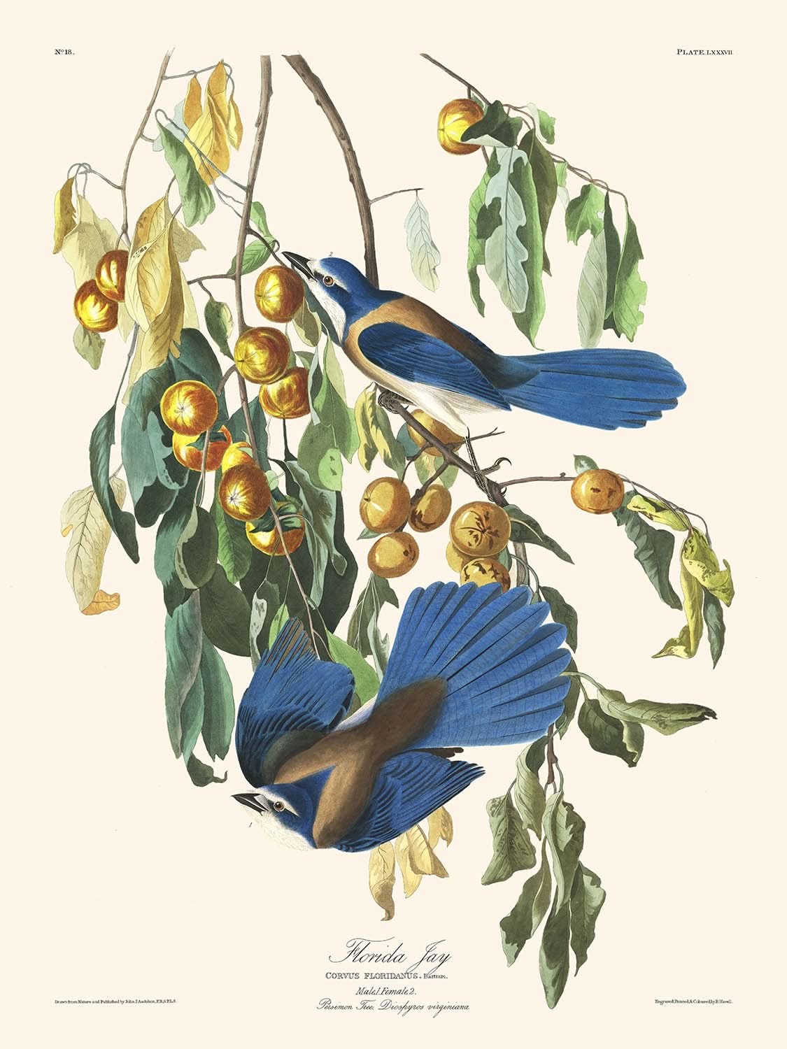 Florida Jay is a captivating illustration from John James Audubon's renowned collection, "The Birds of America," originally published in 1827. This artwork provides an intimate glimpse into the natural world of the Florida Jay, a bird known for its vibrant presence in the south-western regions of Florida. With Audubon's keen eye for detail, this print captures the grace and elegance of this elusive bird, offering a snapshot of its rich plumage and characteristic behaviors.