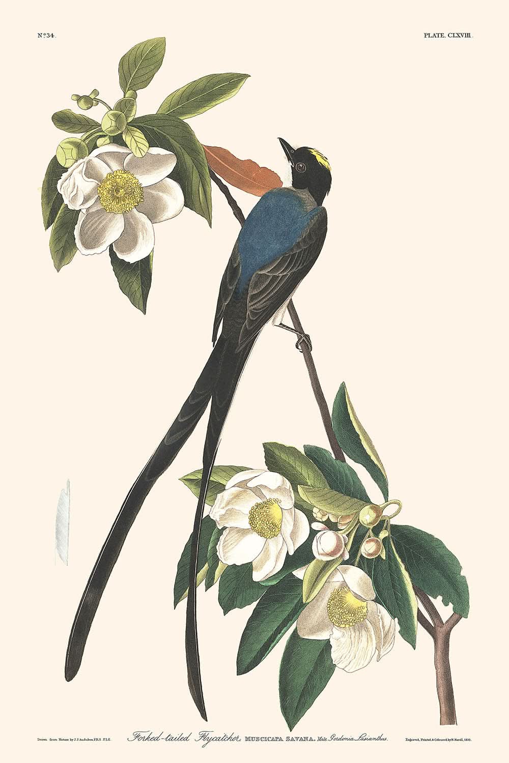 Fork-tailed Flycatcher (Plate 168), illustrated by the renowned naturalist and artist John James Audubon, is a captivating bird illustration from his celebrated series, Birds of America. Compiled in 1827, Audubon’s works are noted for their intricate detail and lifelike representations of avian species, capturing the vivid individuality of each bird in its natural habitat.