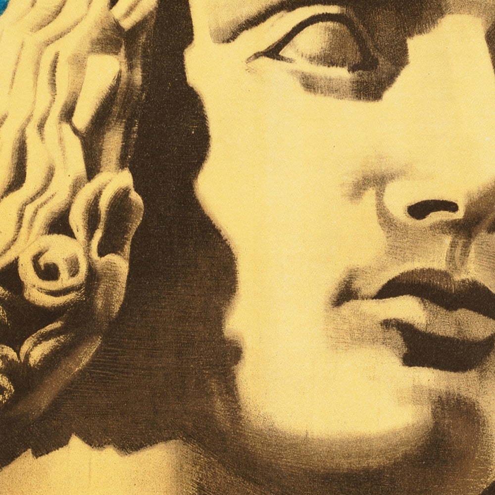 Design notes: The dominant blue background binds the collage into a unified landscape, while the statue’s honey-gold tones and soft brown shadows pull the eye forward, giving the piece a sculptural presence on the wall. Eschle’s serif lettering in a muted stone-grey complements the classical motif without overpowering it. The interplay of cool and warm colors—blue, yellow, and brown—creates a timeless, sophisticated look that suits contemporary interiors as well as traditional libraries or studies.