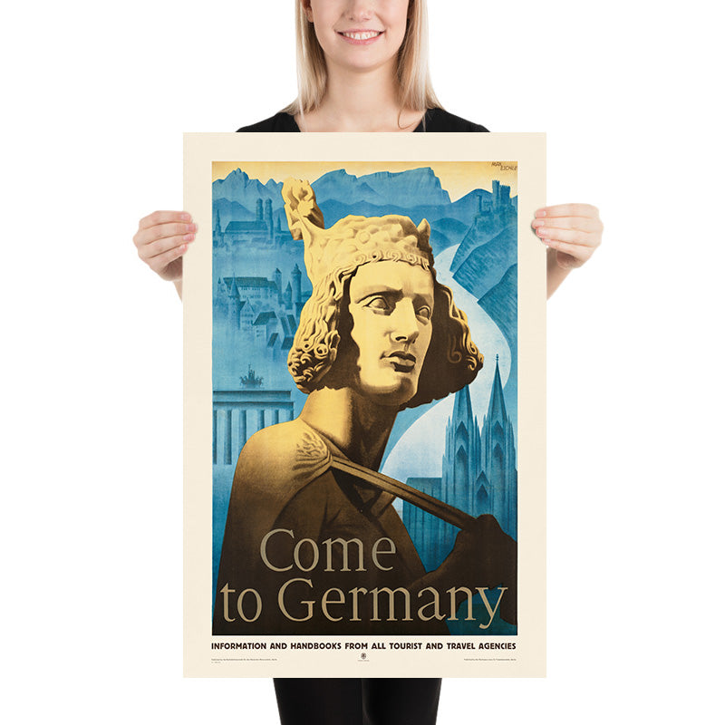 Come to Germany by Max Eschle is a classic European travel poster that invites visitors to discover Germany’s cities and landscapes. Likely created in the interwar years, it was produced for the national railway’s tourism office in Berlin and aimed at English‑speaking travelers—the invitation “Come to Germany” appears boldly across the lower third. Eschle sets a monumental golden statue of a medieval figure in the foreground, its sword cutting diagonally across the image, while a cool blue montage unfolds behind: the twin spires of a great Gothic cathedral, a sweep of river resembling the Rhine, the Brandenburg Gate’s columns, castle silhouettes, and distant Alpine ridges. The contrast of warm ochres against layered blues gives the scene both grandeur and serenity, perfectly capturing the romance of continental rail travel.