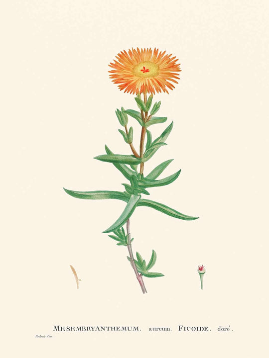 Golden Fig-Marigold by Pierre-Joseph Redouté is a stunning Victorian botanical illustration that beautifully captures the essence of its subject, the Mesembryanthemum Aureum. Pierre-Joseph Redouté, renowned for his meticulous detail and artistic skill, created this masterpiece in 1802 during a prolific period of his career as he painted the exquisite flora of Château de Malmaison at the behest of Josephine Bonaparte, Napoleon's wife.