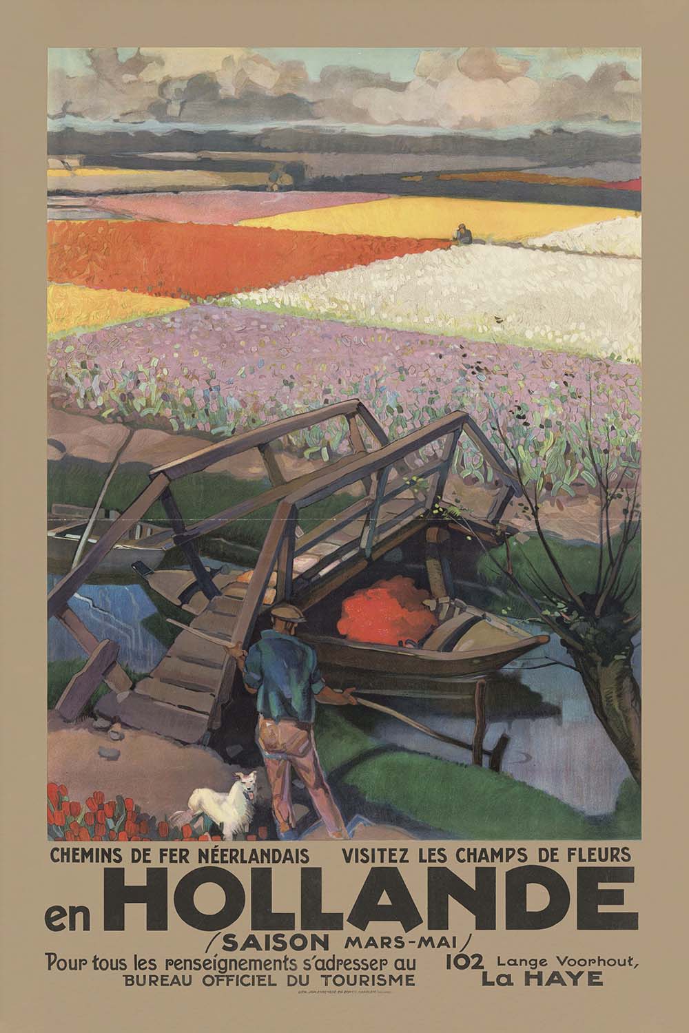 Chemins de fer néerlandais: visitez les champs de fleurs en Hollande (1903) is a luminous early-Edwardian railway poster inviting French-speaking travelers to experience Holland’s famed springtime spectacle. Created for the Dutch railways and printed in French to entice visitors from Paris and Brussels, the artwork celebrates the flower belt of South Holland—fields of tulips stretching across the low, sea-level polders. The original artist is unknown, but the poster’s confident lettering and elegant, simplified forms place it squarely in the Art Nouveau era. Notably, the composition pairs a warm, sunlit ground with rich accents—an effect you can see in the poster’s dominant yellow tones offset by vivid reds and soft browns—and a bold French headline across the top.